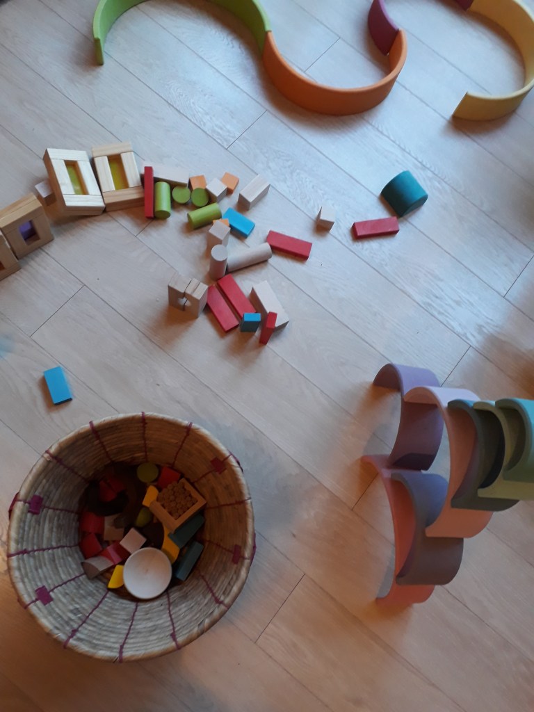 Les blocs sont dans le salon et les sœurs (3 et 8 ans) y jouent très régulièrement. Elles imaginent des univers avec. D’autres jouets en bois ont été rajoutés comme des loose parts (rondins de bois, perles, petits bols en bois…), des figurines basiques en bois (que je décore au fil des saisons), des jouets d’empilage comme l’arc en ciel de la marque Grimm’s. Nous avons aussi de multiples animaux en bois qui viennent avec les personnages peupler maisons, zoos, châteaux, villes, ponts… imaginées avec ces jouets si simples en bois.