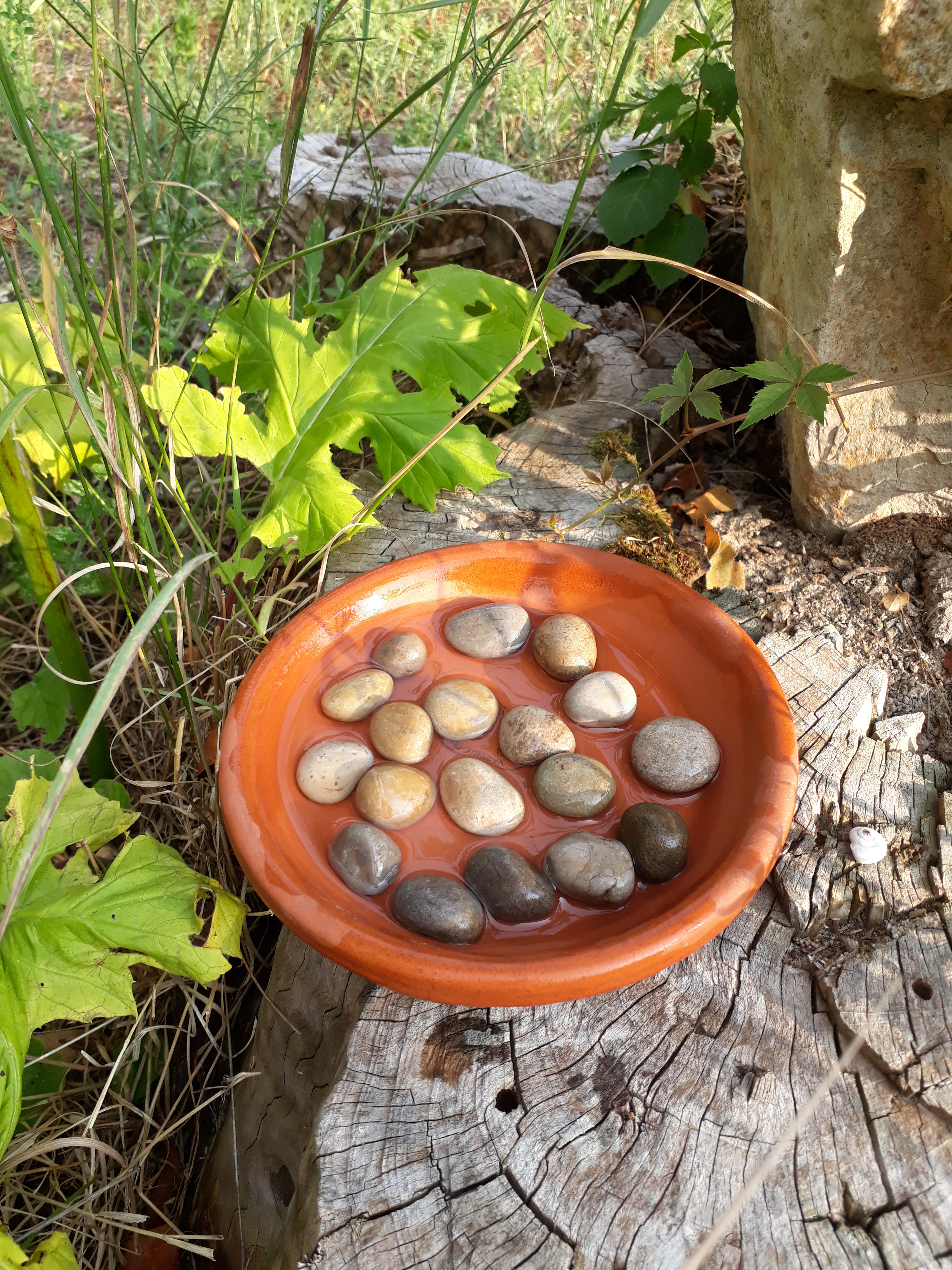 Cet été, sur une idée de Maman Happycultrice, nous avons installé un point d’eau pour les petits animaux. Une coupelle remplie d’eau avec quelques galets pour éviter aux insectes de se noyer. Bien sûr, la coupelle se retrouvait souvent sèche à cause de la chaleur.