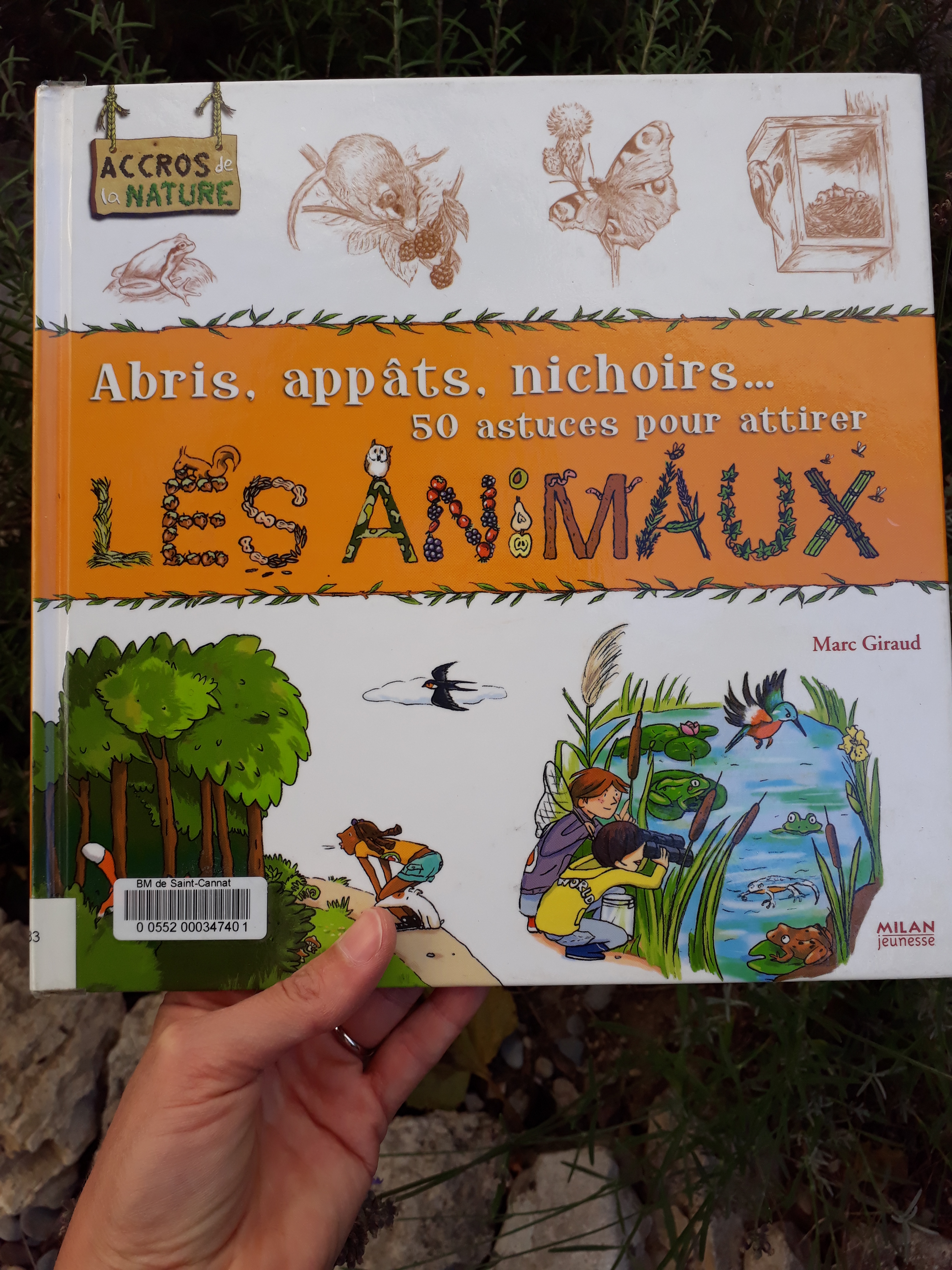 Il y a quelques semaines, nous avons emprunté un livre très intéressant à la bibliothèque. Abris, appâts, nichoirs… 50 idées pour attirer les animaux est un livre de Marc Giraud, publié chez Milan Jeunesse.