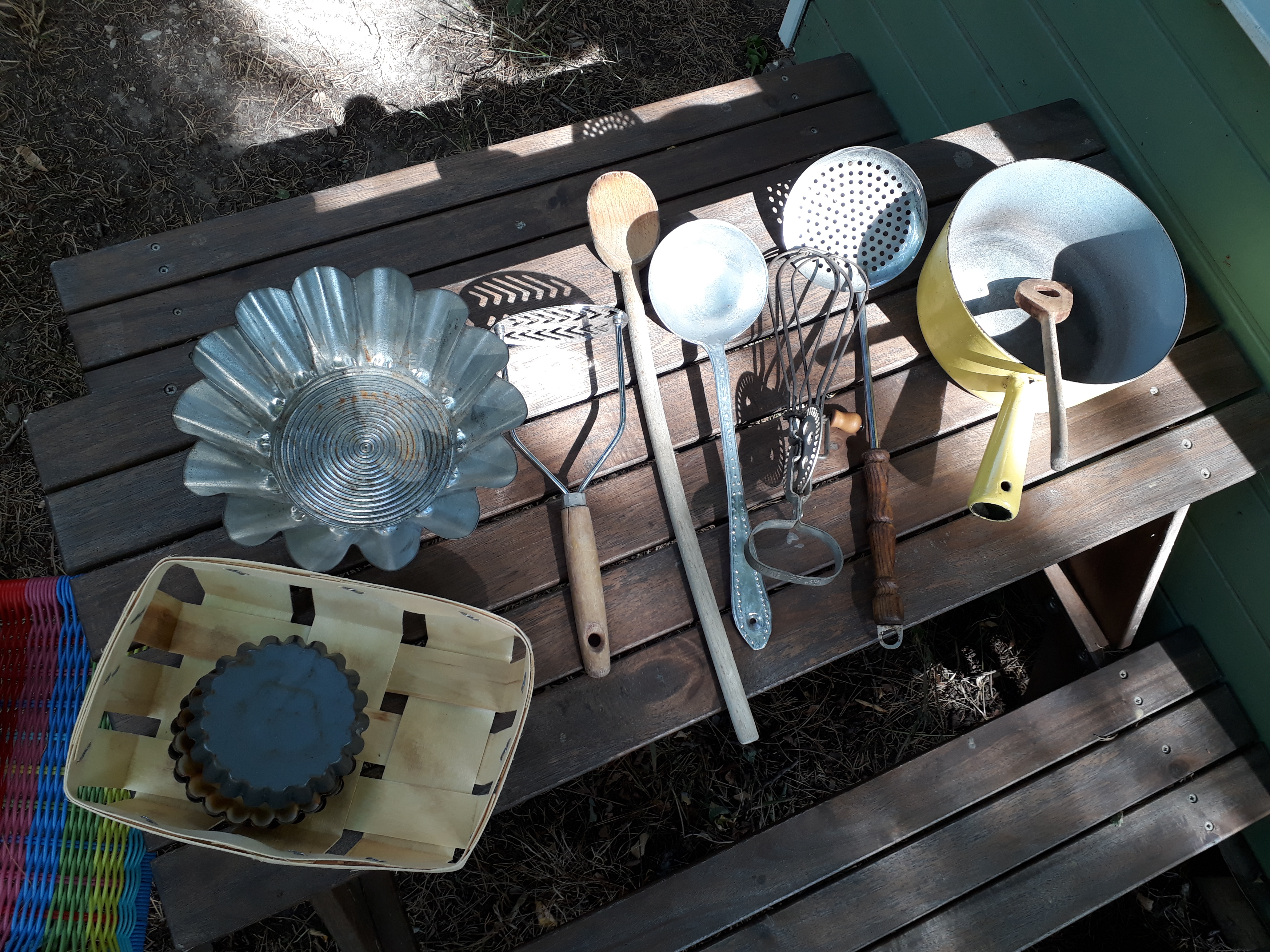 J’ai chiné durant l’été des ustensiles de cuisine qui ne craignent pas de trainer dans le jardin et qui auraient probablement fini leur vie sous peu dans une poubelle. C’est tellement amusant de patouiller dans le jardin.