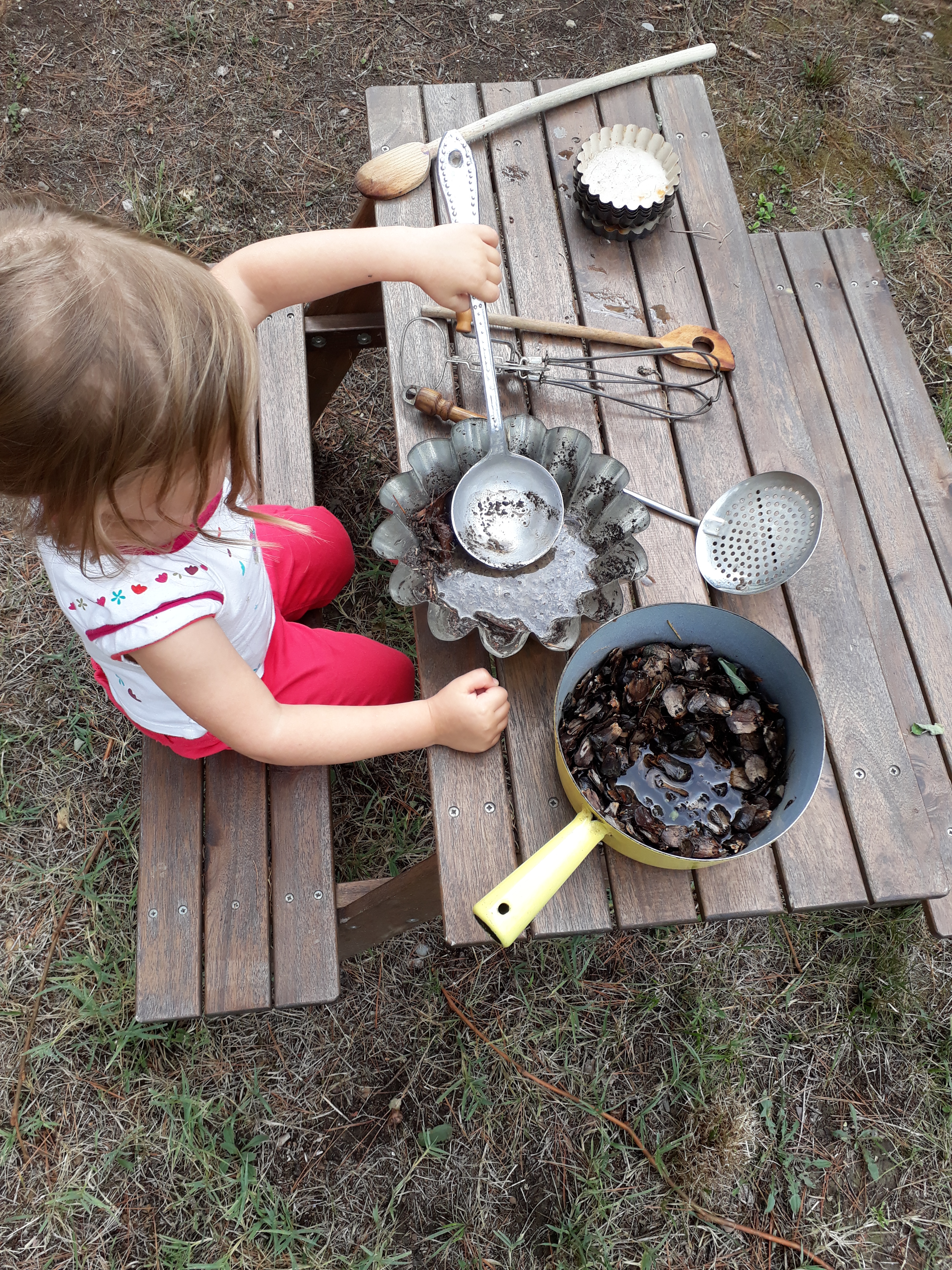 Le jardin est très sec en cette fin d’été pour le bonheur des enfants. Parce ce n’est que mauvaises herbes desséchées, terre et aiguilles de pin ; la matière première parfaite pour faire des soupes de boue, tartes aux aiguilles de pin ou autres ragouts de pommes de pin.