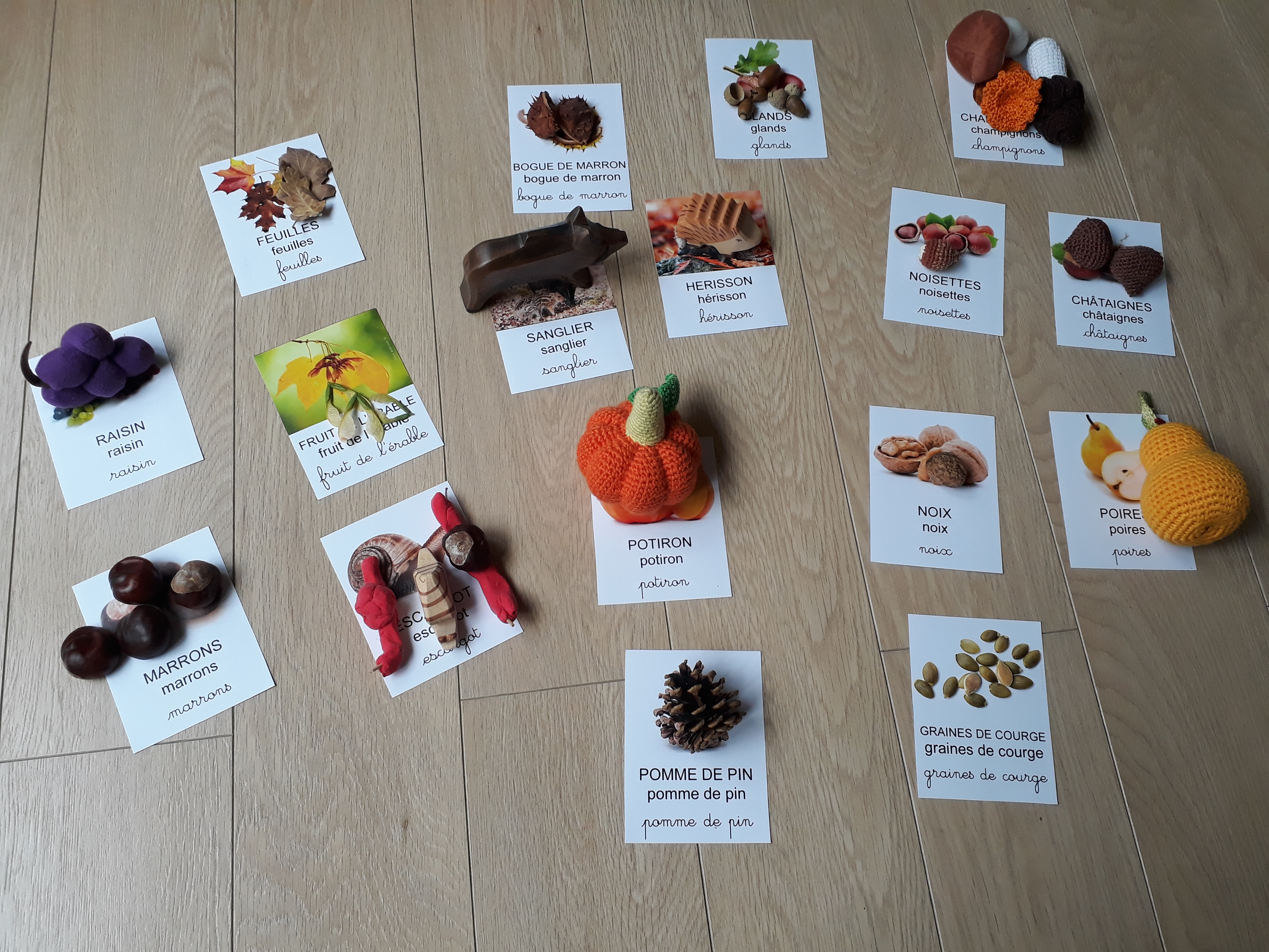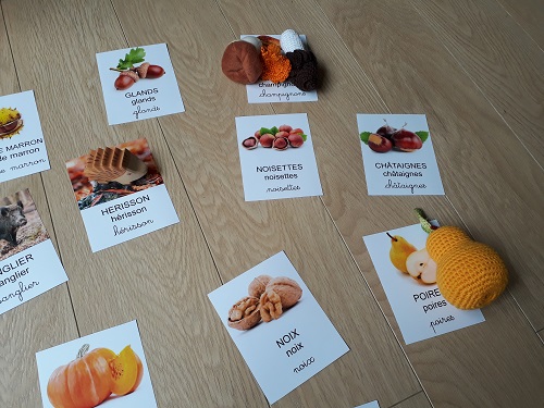 Lundi, je vous ai montré notre table d’automne avec ses petits animaux en bois, ses trouvailles de balade et ses fruits et légumes de saison (version dinette). Mais, dans un coin du buffet, il y a aussi une petite pochette avec des cartes de nomenclatures sur le thème de l’automne, trouvées chez Maman Happycultrice. Mais qu’est ce qu’une carte de nomenclature ? C’est un peu un imagier en version carte. L’intérêt est d’apprendre de nouveaux mots, d’associer des photos avec le vocabulaire correspondant, et pour les lecteurs, de découvrir l’écriture (capitale, script et cursive) de ces mots.
