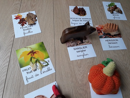 C’est sous forme de jeu d’association que nous avons utilisé les cartes. J’ai proposé aux filles de retrouver sur la table des saisons les éléments en photographie sur les cartes. J’avais au préalable sélectionné les cartes représentées. Alors, qu’est ce qui un marron (dans nos trésors de la nature) et qu’est ce qui est une châtaigne (dans nos aliments en crochet) ? Quel est le nom de l’enveloppe du marron ? C’est chouette ces graines ailées qui tournent comme des hélices d’hélicoptère, non ?