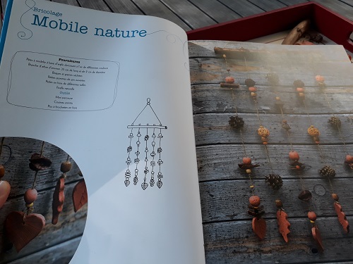 Pour décorer le mur au dessus de notre table des saisons, nous avons créé un mobile. Nous nous sommes inspiré d’un modèle de mobile nature dans le livre Petits bricolages d’automne pour enfants, publié chez L’inédite. Bon, nous avons fait plus simple.