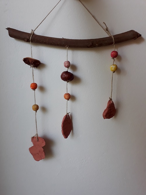 Après séchage des modelages, j’ai fait l’assemblage en intégrant des éléments naturels trouvés dans le jardin ou lors de balade : branche, marron, bogue. J’ai utilisé une vrille pour faire des trous dans ces trois éléments. Une ficelle en lin, des nœuds… et l’assemblage du mobile était fait.