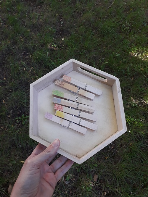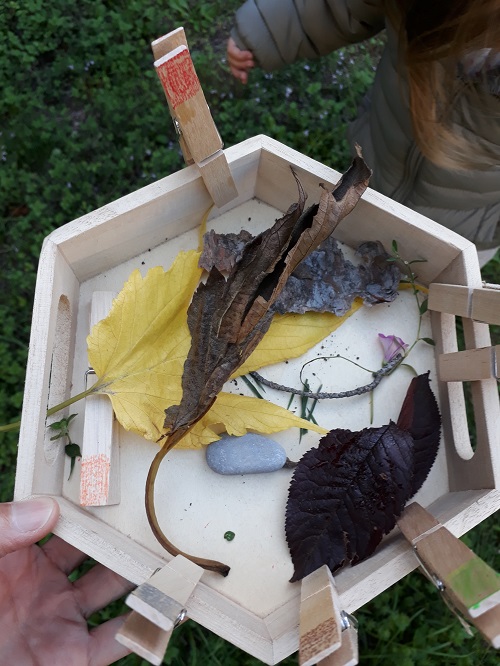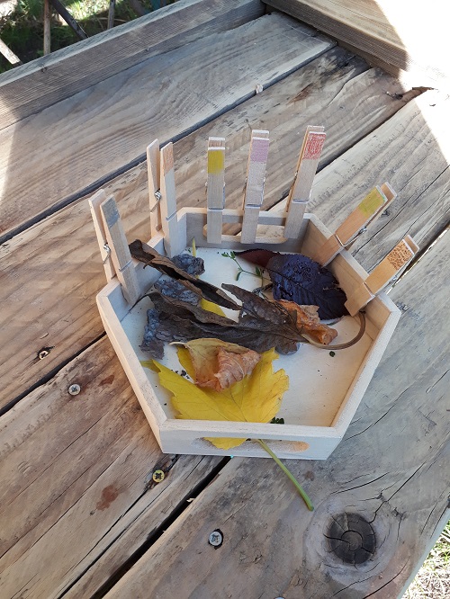 Un petit plateau, des pinces à linge colorées au crayon. Vert, orange, jaune, rouge, marron, gris et rose. J’aurais pu ajouter le violet (il restait quelques fleurs mauves dans le jardin) et le noir (les baies de sureau). Le but : trouver au moins un élément nature de la couleur de chaque pince.