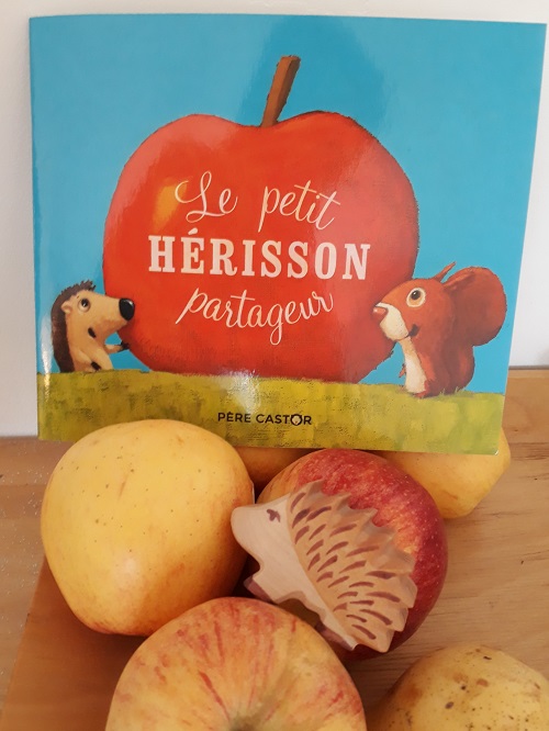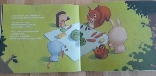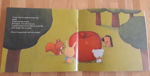 Un hérisson trouve une belle pomme. Il décide de la cacher pour la manager plus tard. L’écureuil l’aperçoit. Il décide de se la partager et s’entraide pour la cacher. Le lapin les aperçoit… La souris les aperçoit… Au final, ce sont quatre animaux qui se partage cette pomme. Mais à quatre cela fait une petite part et ils ont encore faim. Heureusement, chacun a d’autres réserves pour partager lors d’un pique-nique commun.