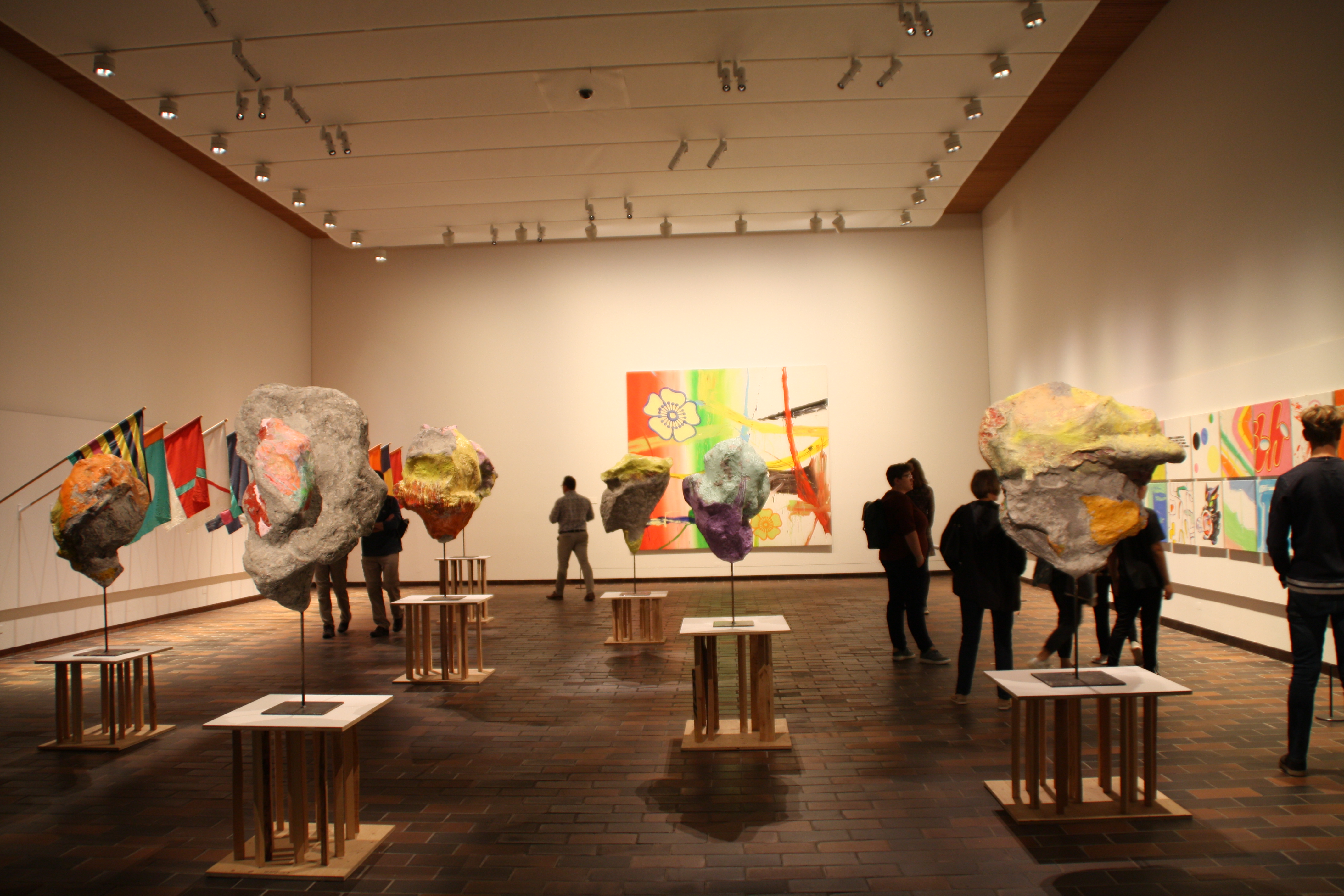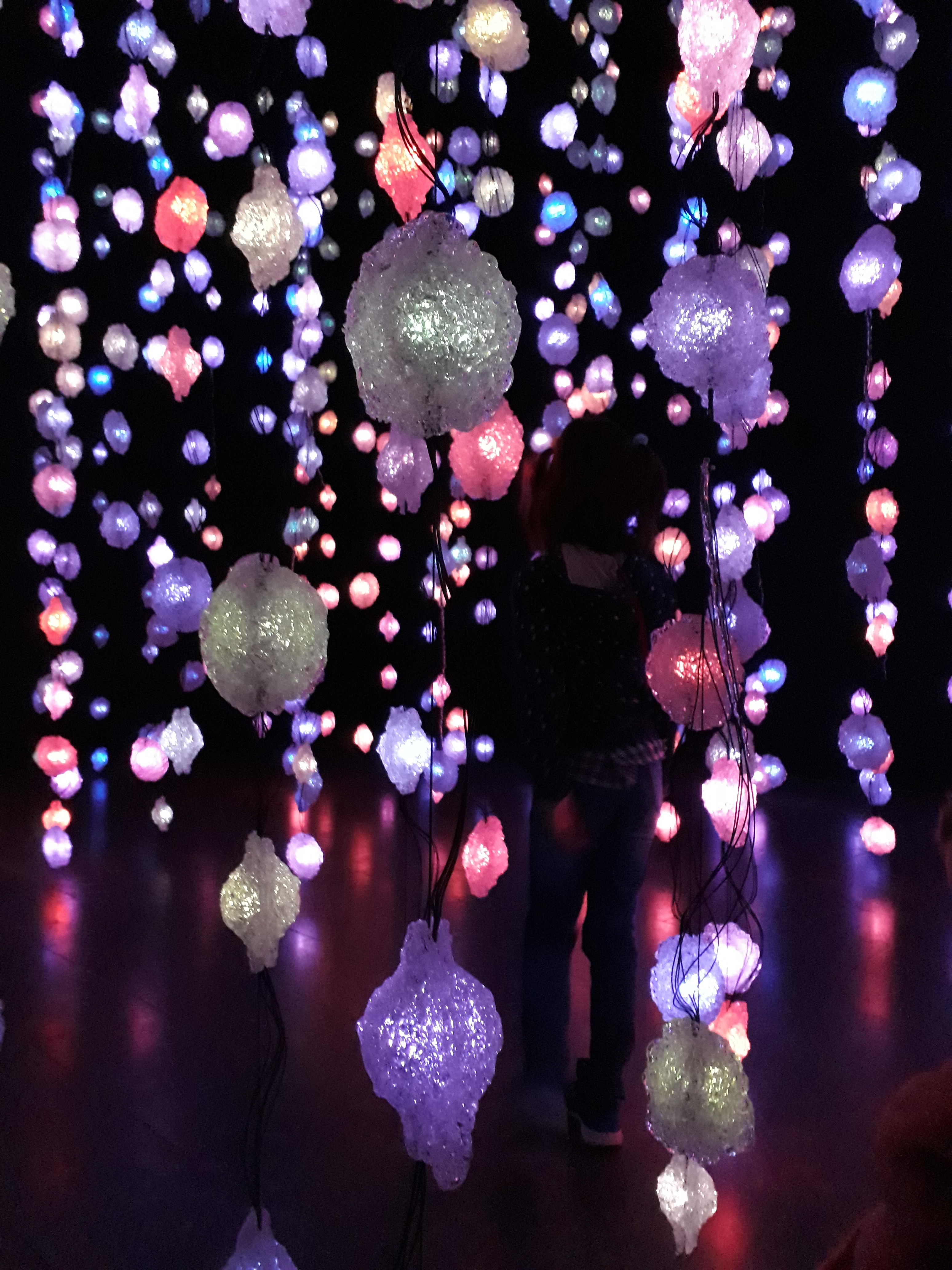Puis, nous sommes allés découvrir l’exposition de Pipilotti Rist, de l’art immersif. D’abord perplexes en voyant les premières vidéos, nous sommes tombés en admiration de deux installations artistiques. Une première salle plongée dans le noir avec une projection au plafond d’images filmées dans une mare ou rivière, accompagnée de musique originale. Les visiteurs étaient invités à s’allonger sur des lits pour les visionner. Une deuxième salle proposant une déambulation au milieu d’une multitude de guirlandes électriques dont l’éclairage oscillait entre le blanc, rose, mauve et rouge.