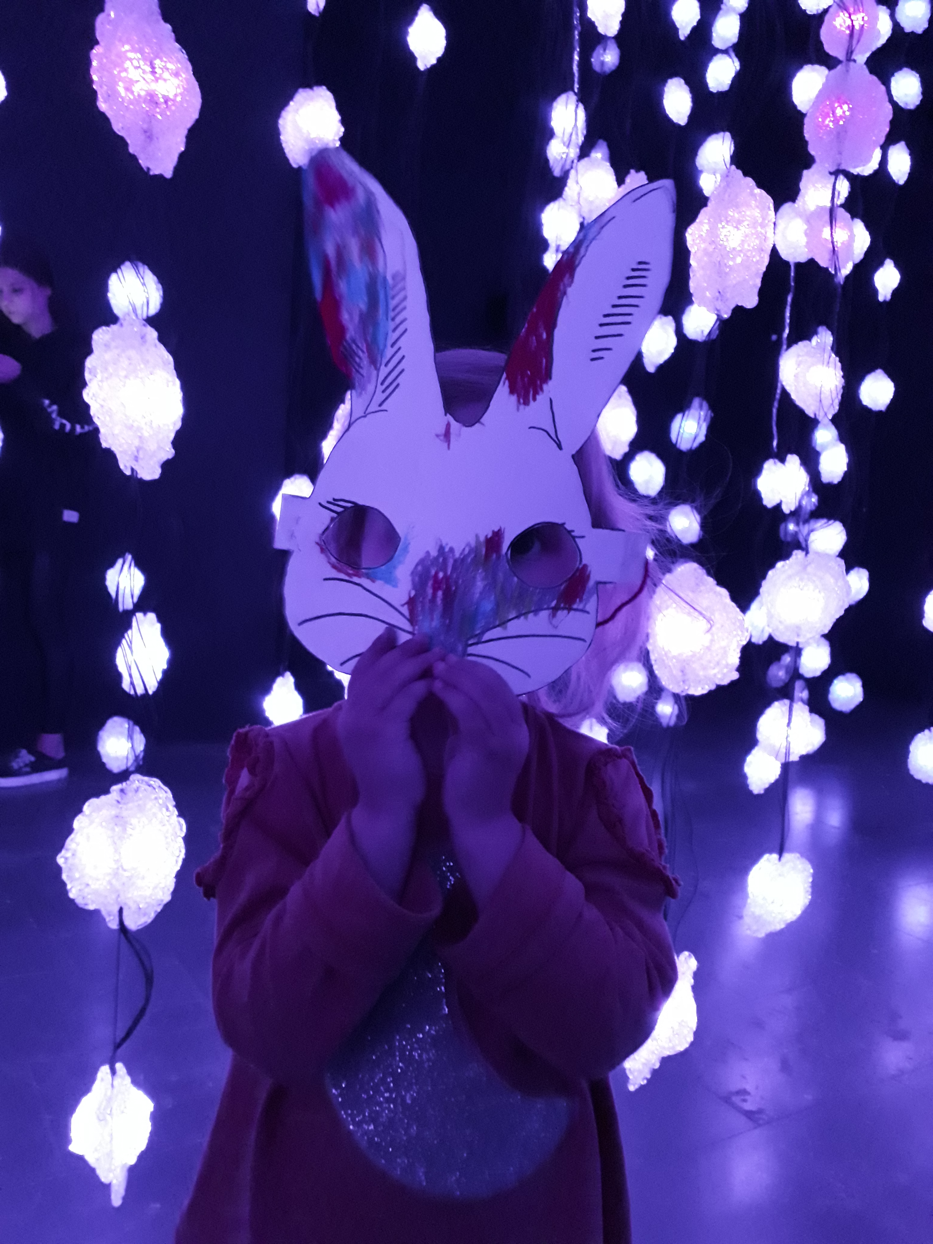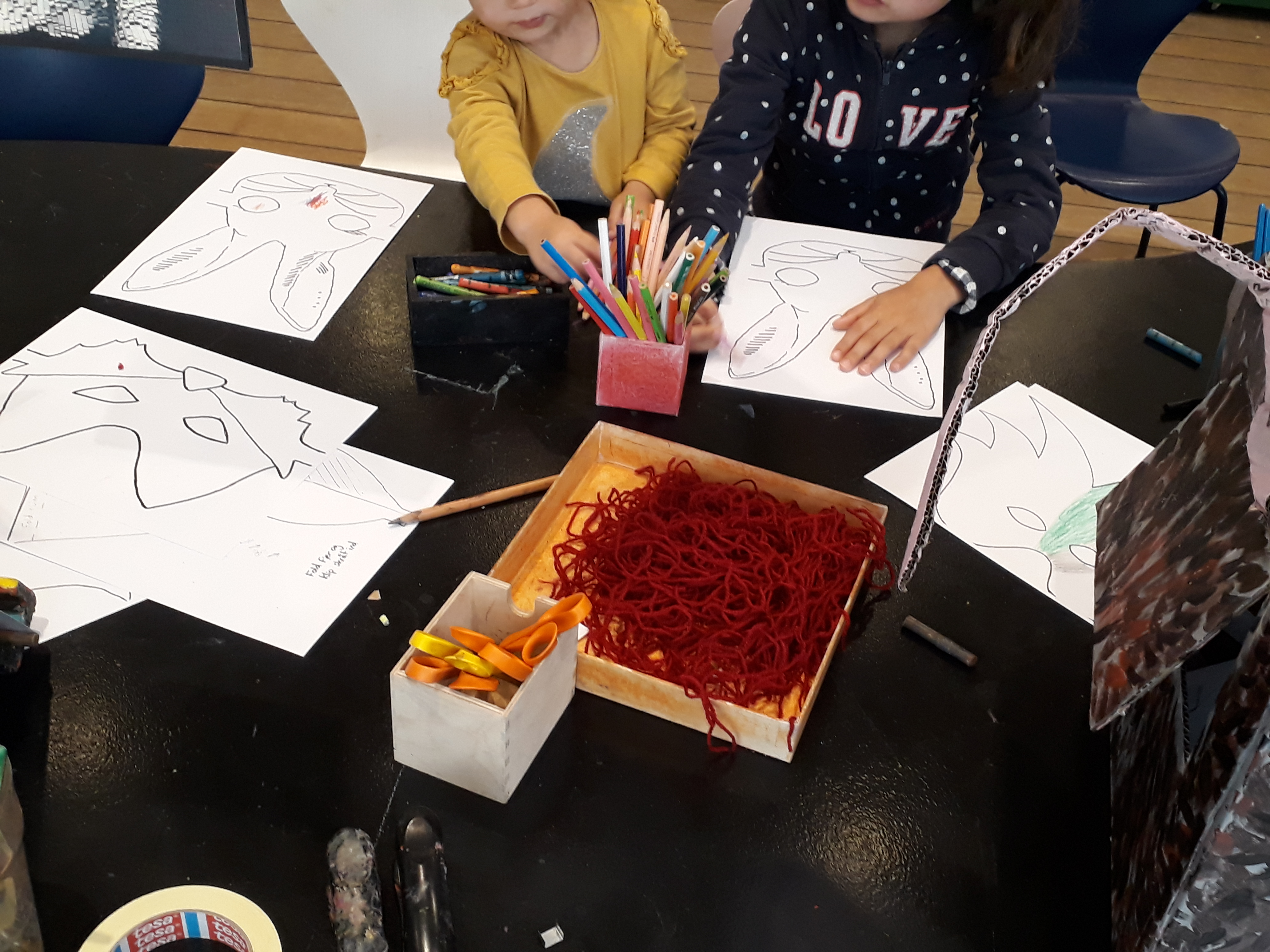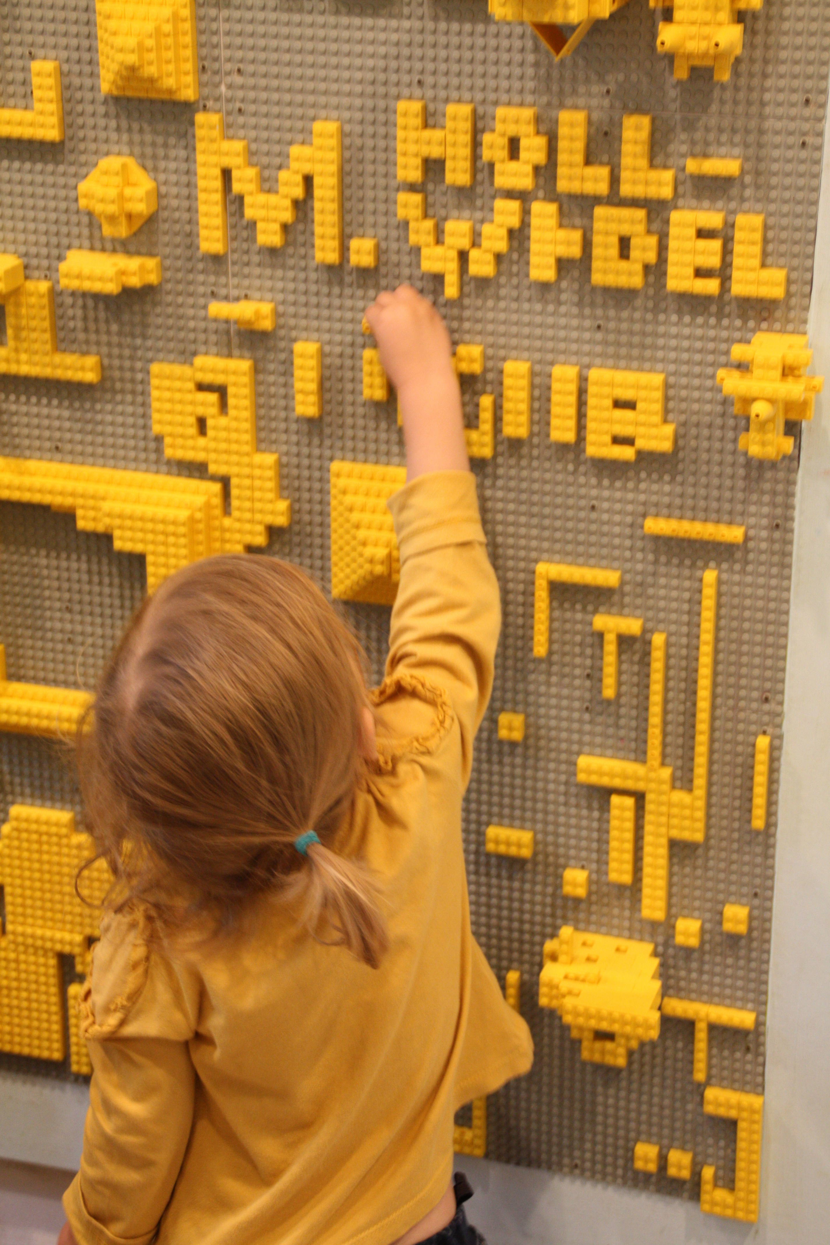 Après avoir fait un tour de l’exposition permanente, nous avons fait une pause déjeuner (avec toujours des sandwichs ouverts…). Nous avons ensuite rejoint l’espace des enfants. Une aile est consacrée aux enfants sur trois niveaux avec pas moins de 6 ou 7 ateliers libres. C’est-à-dire que nulle réservation (ou participation financière) n’est nécessaire. Sur des tables est disposé tout le matériel nécessaire pour réaliser un masque, ou bien des meubles miniatures, à moins que les enfants préfèrent le modelage… Chaque atelier est en rapport avec une œuvre ou un artiste exposé au musée, bien évidemment. Les filles ont réalisé chacune un masque animalier et ont joué avec les milliers de briques lego, uniquement jaunes.