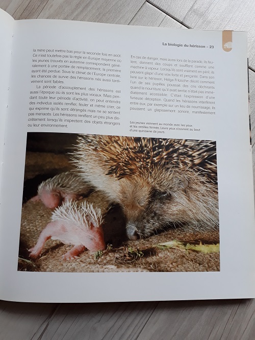 Le deuxième livre est beaucoup plus détaillé avec trois gros chapitres sur la biologie du hérisson, le hérisson au jardin et les soins à apporter aux hérissons (mais s’il est recommandé de contacter une association si l’on trouve un hérisson mal en point). C’est surtout moi qui l’ai lu pour en apprendre plus sur l’hibernation du hérisson et savoir où installer son abri (mais je vous en reparle vendredi). Mais c’est aussi un livre avec de nombreuses photographies. Et c’est mignon un hérisson, un bébé hérisson, des bébés qui tête, des petits qui font leurs premières sorties en suivant leur maman…