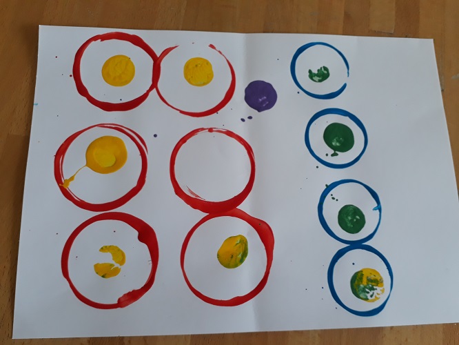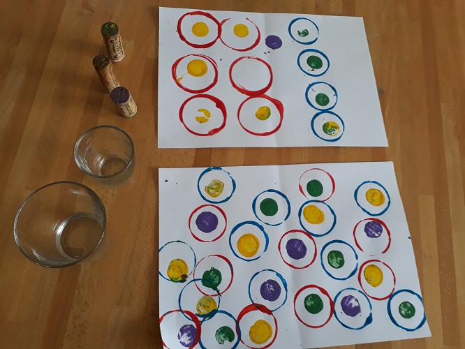 J’ai préparé des bouchons de liège et des verres de différentes tailles et proposé aux filles (enfin, à la cadette au départ) de réaliser des empreintes. Elles ont donc trempé les accessoires dans la gouache liquide avant de les positionner sur la feuille pour réaliser cercles et ronds. La cadette a opté pour des ronds contenus dans des cercles de diamètre plus important. L’aînée a suivi l’idée de sa sœur 😉