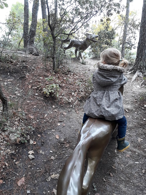 La plupart des œuvres étaient immenses et il était possible d’y rentrer, de les toucher ou de jouer avec. Comme un pont que nous avons franchi, des grilles colorées que les filles ont pu faire coulisser sur des rails, une cloche à faire tinter, une tour où se cacher ou des renards à chevaucher…