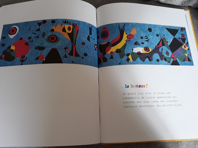 Il y a des livres pour lesquels j’ai un vrai coup de cœur, mais qui n’emballent pas plus que cela les filles. Peut-être que ce dialogue entre un père et sa fille est un peu long, peut-être que le rêve qu’elle raconte est, comme beaucoup de rêves, un peu trop étrange. Mais les illustrations qui sont des tableaux du peintre espagnol Joan Miro sont superbes.