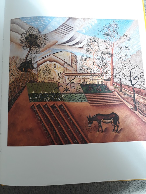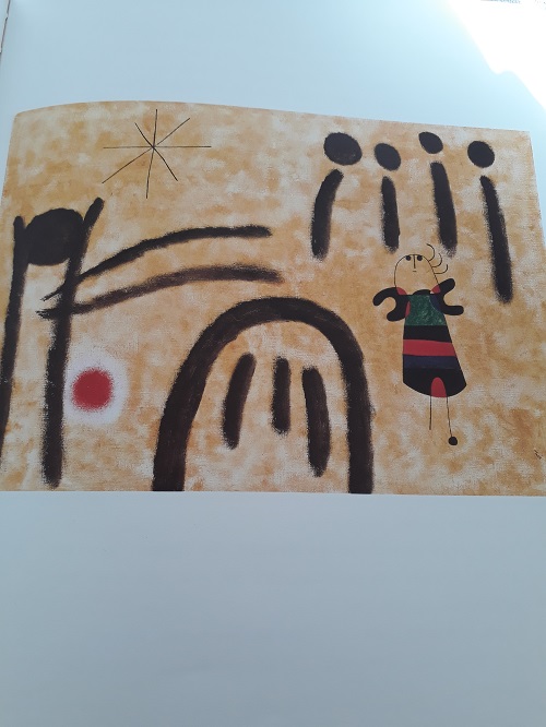 Un ciel bleu et de l’autre côté la ferme de l’enfance de son papa avec tous les détails et anecdotes que celui-ci avait dû lui raconter auparavant : l’âne Jérémy, les lettres reçues par Miss, un escargot bleu, le poulain vendu au cirque… et sa rencontre avec sa maman. Le tout accompagné de tableaux du figuratif à l’abstrait, peints de 1919 à 1961, de l’artiste Miro.