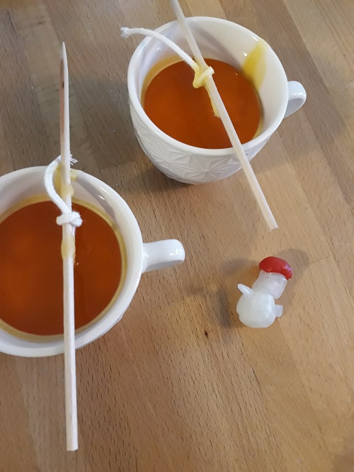 J’ai trouvé les cires et les mèches dans la chouette boutique de loisirs créatifs Mercurius. J’ai coupé un morceau de mèche à bougie. Je l’ai maintenu au centre de la tasse en faisant un nœud sur un pic à brochette. J’ai fait fondre la cire naturelle au bain marie. Il m’a fallu une tasse bombée de pastilles de cire. Pendant ce temps, j’ai proposé aux filles de modeler des petites décorations avec la cire colorée. Cela pouvait être des formes plates ou en relief. La grande a réalisé un bonhomme de neige avec un bonnet rouge. La cadette a fait plus abstrait. Une fois la cire naturelle devenue liquide, je l’ai versée dans les tasses. Et avant que les bougies ne soient complètement froides, j’ai posé les créations des filles sur le dessus.