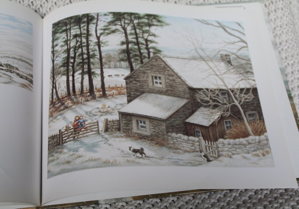 Première neige raconte un moment dans la journée famille habitant dans la campagne. Ils élèvent des moutons et comme le papa est malade ce jour-là, c’est maman et sa petite fille Sara qui vont nourrir les moutons. On les suit donc jusqu’à l’étable sur la colline. On aperçoit des paysages hivernaux de campagne anglaise. Gros Nours, le doudou de Sara est du voyage. Mais au moment où la neige commence à tomber, elle l’oublie au milieu des moutons. Heureusement un des chiens lui ramène. De retour à la maison, le décor est tout blanc mais la neige s’est arrêtée de tomber. Sara et maman vont se réchauffer près du poêle.