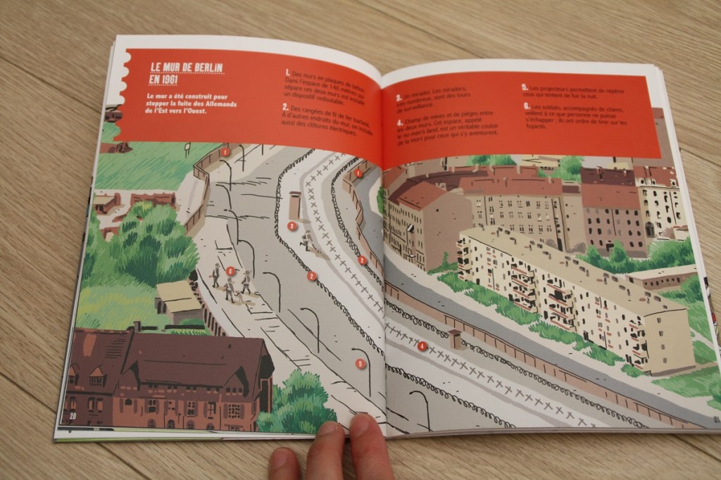 Dans Berlin Est, le 9 novembre 1989, une famille se prépare à fuir l’Ouest. Quand le père est arrêté par la Stasi, le plan tombe à l’eau… jusqu’à que tout Berlin clame que le mur est tombé. L’histoire est plus courte, vraiment adaptée à partir de 9 ans. Et c’est très intéressant d’avoir des pages documentaires pour comprendre le contexte historique. La véritable histoire de Magda, témoin de la chute du mur de Berlin est un livre de Laurence Paix-Rusterholtz et Christiane Lavaquerie-Klein, illustré par Mary-Gaël Tramonet publié aux éditions Bayard. Ma fille a emprunté d’autres livres de cette collection sur Thomas Pesquet, une jeune fille juive pendant la seconde guerre mondiale (elle m’a dit que c’était très triste) et une autre à Pompéi lors de l’éruption du Vésuve.