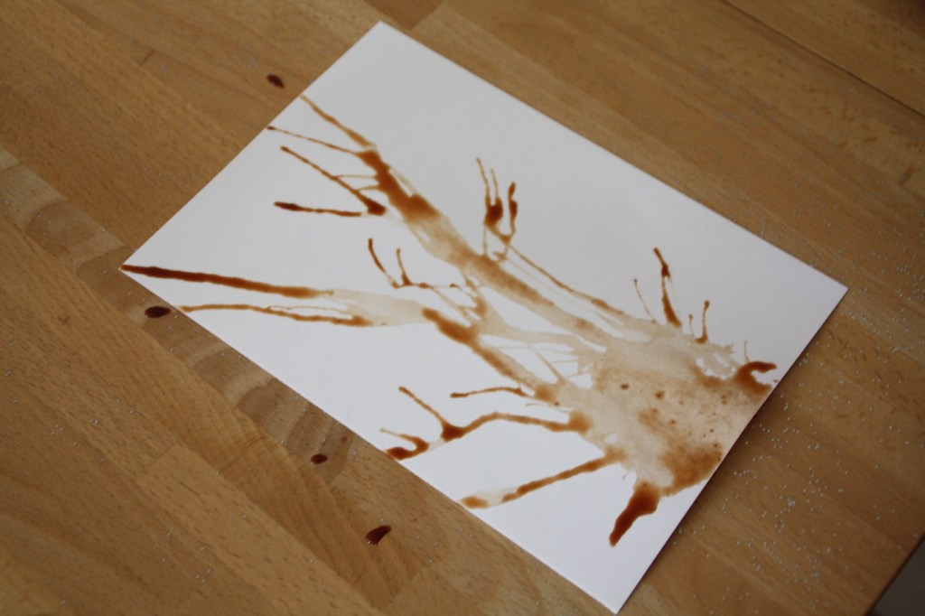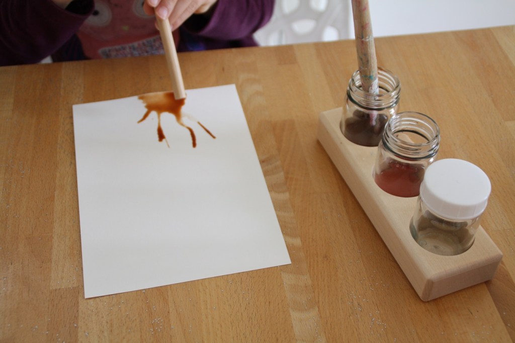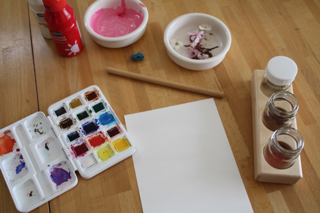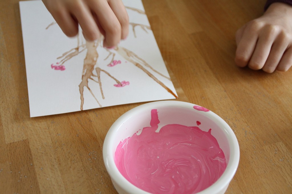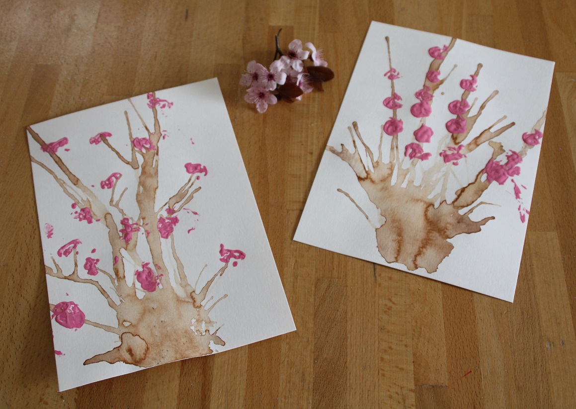 C’est si joli de voir les pruniers du jardin en fleurs, que nous en avons fait un tableau. Pour faire le tronc, nous avons utilisé de l’aquarelle marron bien diluée et une paille pour souffler les branches. Pour les fleurs, nous avons fait de nombreux essais avec toutes sortes d’ustensiles jusqu’à trouver un élastique en caoutchouc tout emmêlé que les filles ont trempé dans la gouache rose.