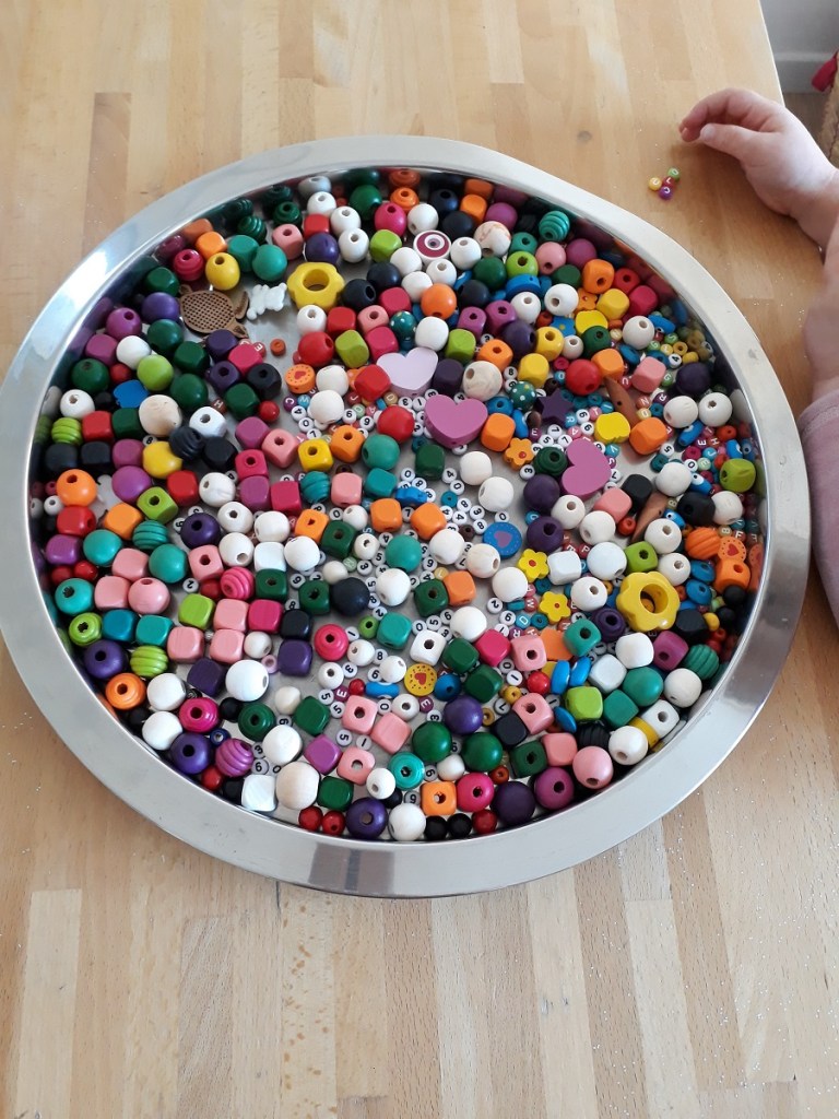 Je voulais juste vous montrer deux ou trois manières de jouer avec l’alphabet. Pour créer des bracelets (notamment ce bracelet d’allaitement), j’ai eu besoin de perles avec chiffres et lettres. J’ai rangé le surplus avec les perles des filles. La cadette peut donc s’amuser à retrouver les lettres de son prénom ou celui de sa sœur pour faire des bijoux. Et quand, c’est pour les copines, j’épèle le prénom (et oui, avec le nom des lettres et pas le son).