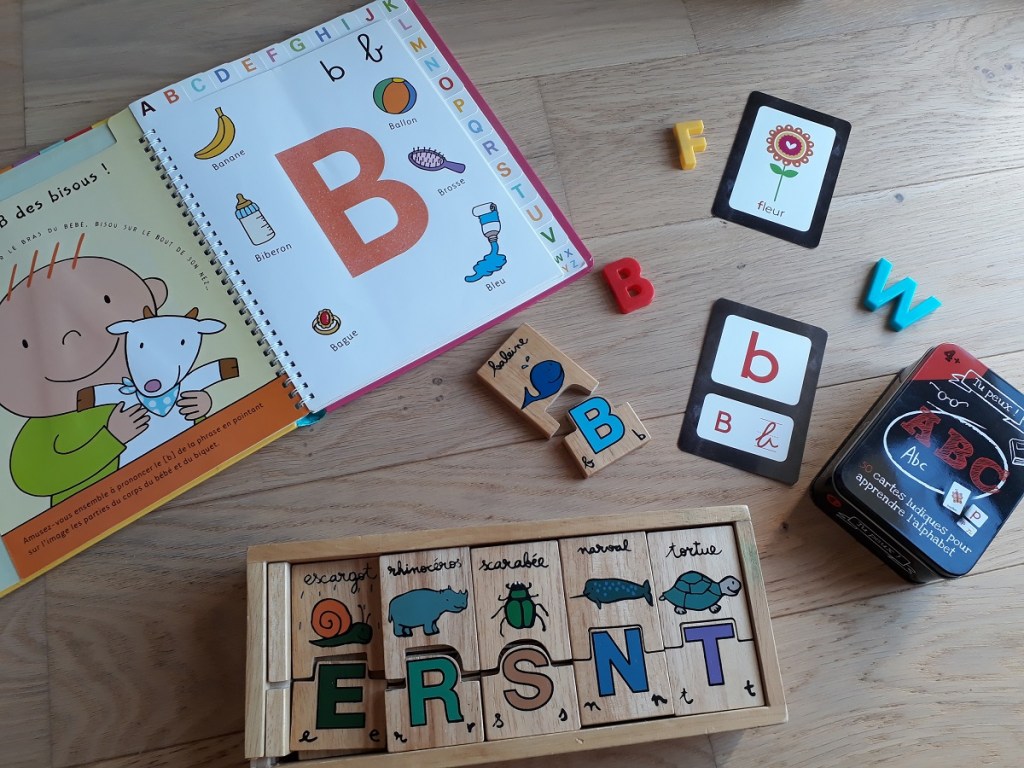 Et enfin, voici une partie de nos jeux autour de l’alphabet comme ce puzzle en bois, ce livre avec lettres en relief (plus de photos juste là), un jeu de cartes et les classiques lettres aimantées. La plupart était à l’aînée.