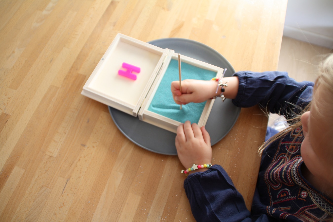 Une fois que l’on reconnaît les lettres, on peut s’amuser à les reproduire. C’est là que la boite à sable devient intéressante. Parce ça change du stylo et du papier, c’est coloré, il suffit de secouer la boite (euh juste de gauche à droite, pas dans tous les sens 😊) pour tout effacer, et puis on finit toujours pas en mettre un peu partout.