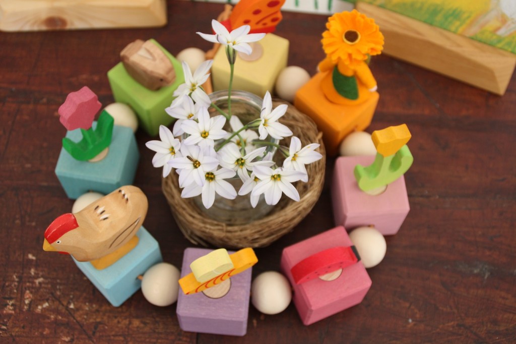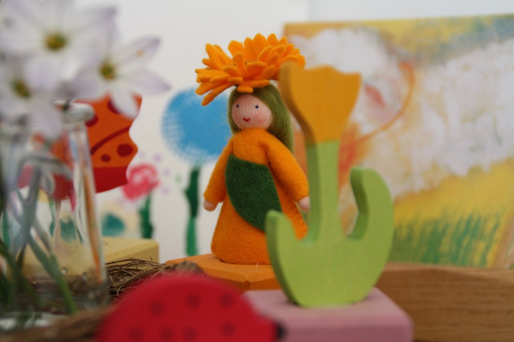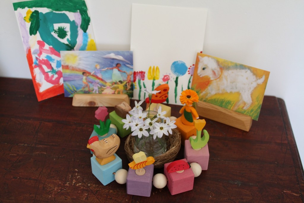 La couronne en bois nous en fait voir de toutes les couleurs ; un arc en ciel en laine cardée (sur la carte postale) lui fait écho ; quelques fleurs ramassées dans le jardin (quelle chance en ce moment !) ; et des peintures de fleurs réalisées par les filles.