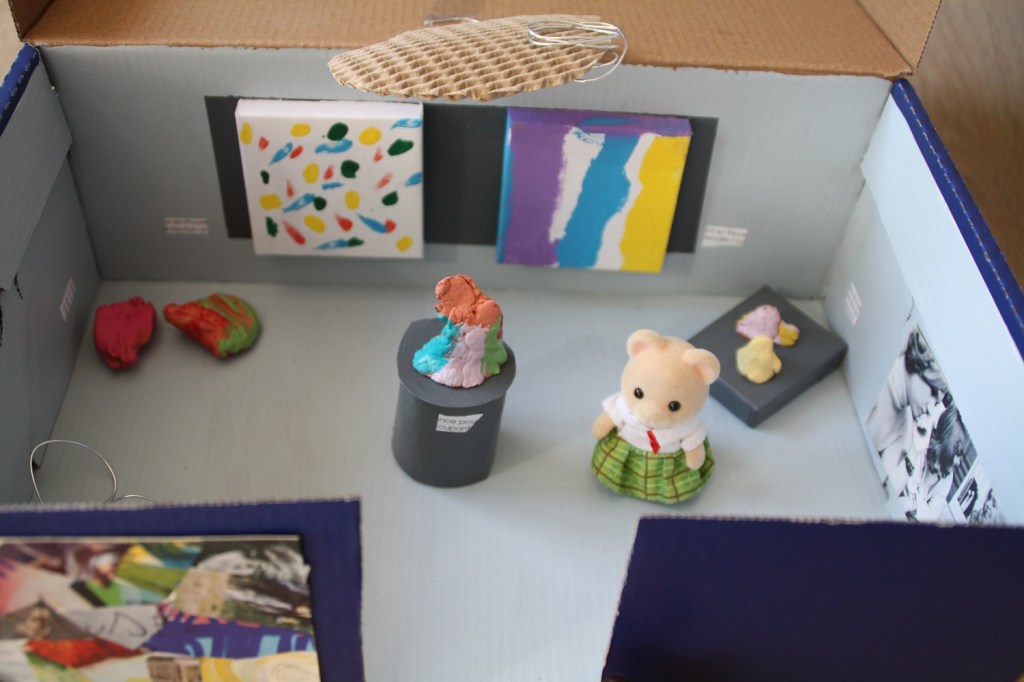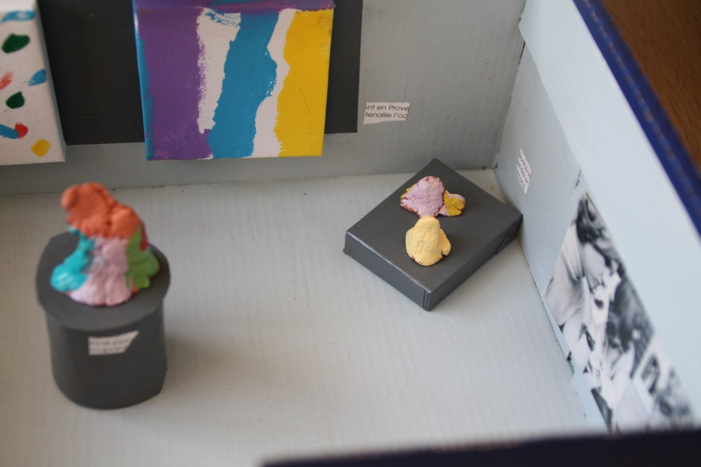 Il y en a qui ne sont pas confinés. Ils ont même le droit de faire des sorties culturelles. Je parle des personnages Sylvanian. Cette semaine, nous avons créé un musée dans une boite à chaussures. Comme je suis plus musée Lousiana ou Guggenheim que musée des beaux-arts, c’est un musée d’art contemporain. Chaque jour de la semaine, nous avons créé, que ce soit de la peinture, du modelage ou de la création en métal pour réaliser des œuvres miniatures (librement, sans s’inspirer d’artistes connus).