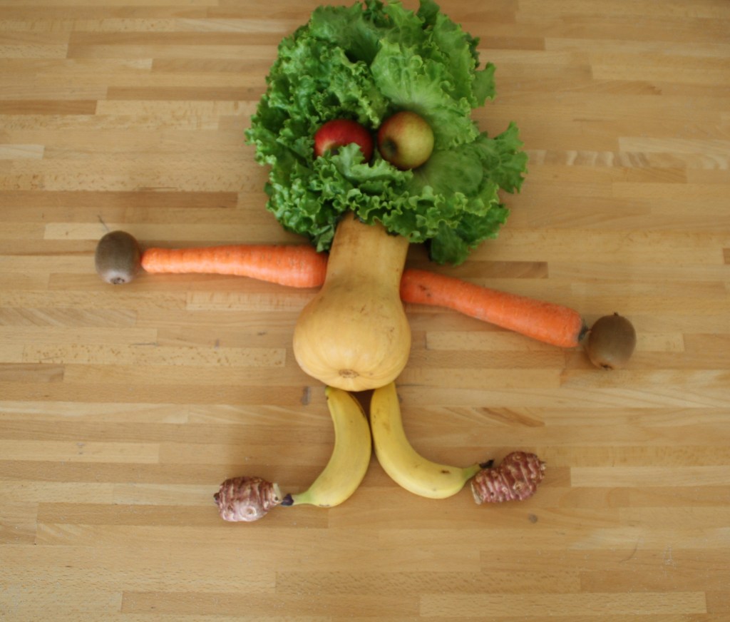 Il y a quelques années, nous nous étions amusés avec la grande à imaginer des bonhommes avec tout et n’importe quoi. Et c’est ce que la maîtresse de petite section a proposé à ses élèves ce week-end. Alors, quand nous avons récupéré nos fruits et légumes de leur quarantaine dans le garage, la cadette a créé son bonhomme vitaminé.