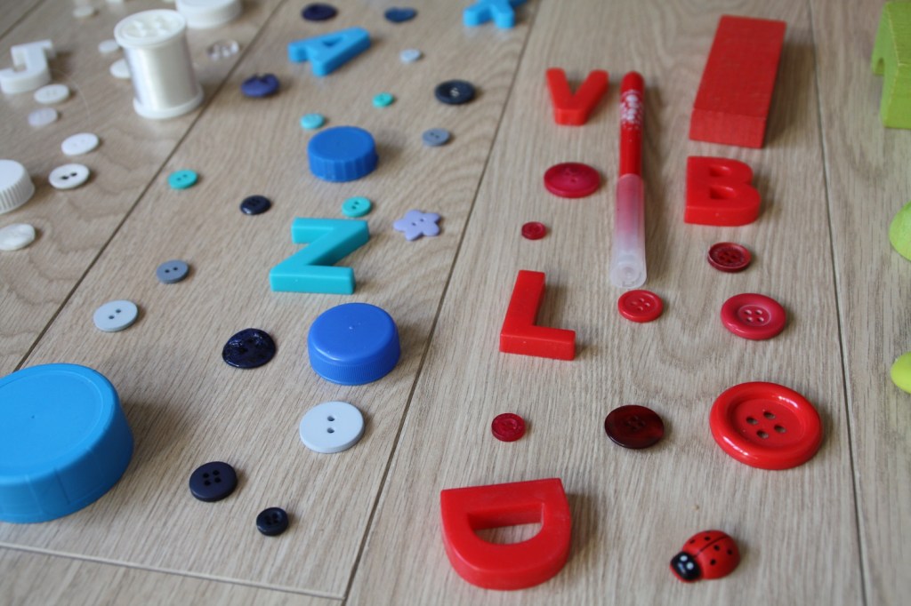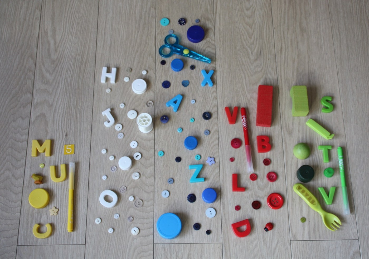 Nous avons créé collectivement une œuvre graphique colorée. Après avoir trié les boutons dans la boite à couture, nous avons cherché dans la maison des petits objets en couleur. Puis, nous avons utilisé les lattes du parquet pour délimiter l’espace de chacune des cinq couleurs (jaune, blanc, bleu, rouge et vert) et organiser tous les objets. C’est entre la revisite d’œuvre d’art et la chasse aux couleurs dans la maison.