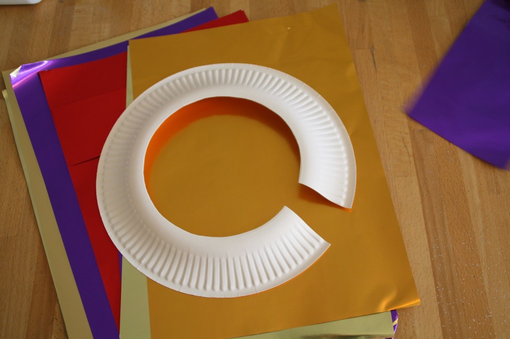 En fouillant dans les placards, j’ai trouvé quelques assiettes en carton et du papier métallisé. Les filles ont pu créer avec des colliers de princesses égyptiennes. Il suffit de couper l’intérieur de l’assiette et de coller des morceaux de papier métallisés dessus. Si vous avez de la peinture dorée, cela peut être joli aussi.