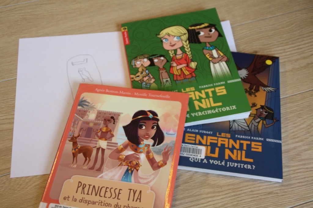 Après le panda roux, nous nous sommes intéressés à l’Egypte ancienne. Ma fille aînée lit en ce moment la série de livres Les enfants du Nil ; enfin, lisait car la bibliothèque étant fermée depuis le confinement, difficile de trouver la suite.