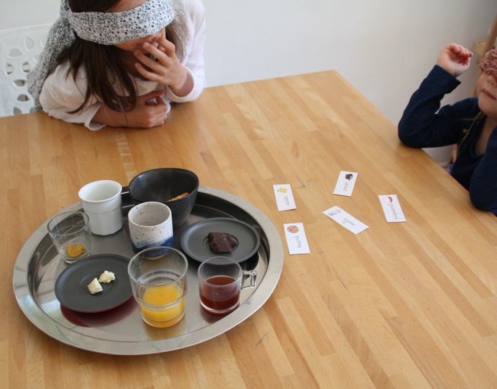 Sur une idée de mes cousines, nous avons fait une dégustation à l’aveugle. Reconnaître avec son odorat uniquement, puis son goût et identifier ce qui est salé, sucré, acide, amer ou piquant. J’ai préparé deux foulards et quelques aliments ou boissons :
