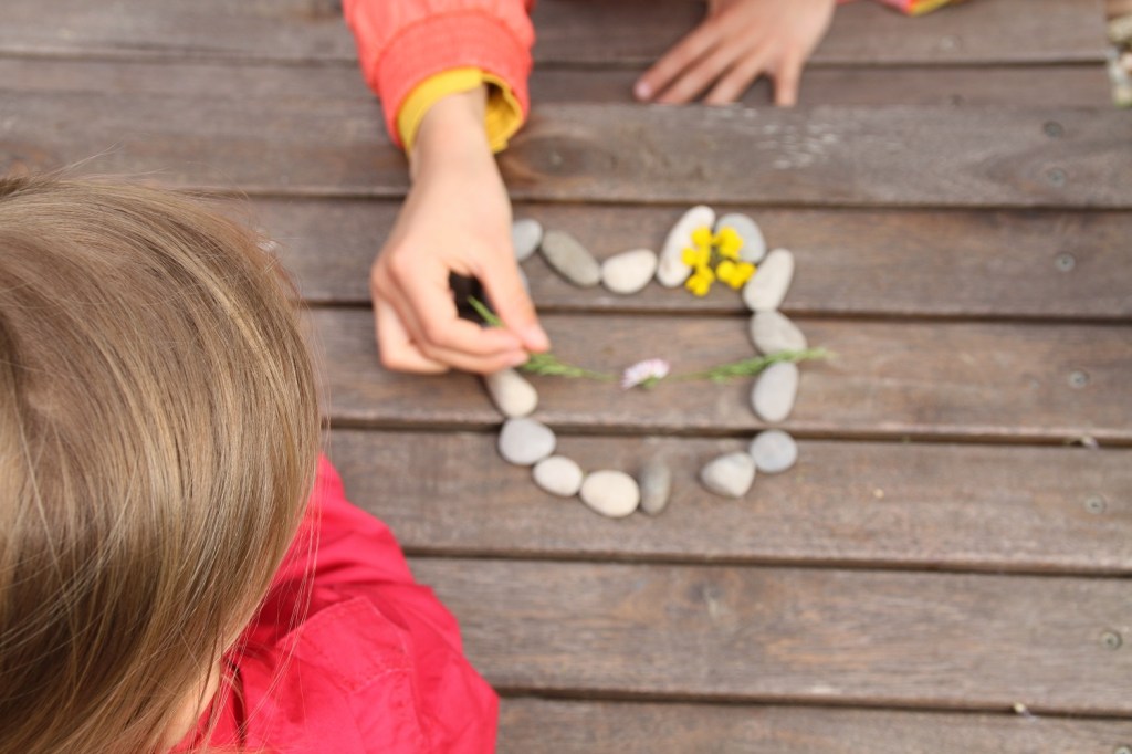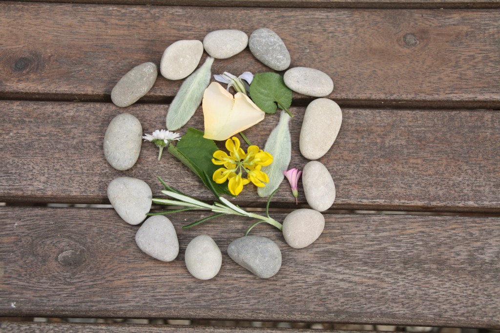 Restons dans le jardin pour s’adonner au land art. Cette fois-ci j’ai délimité avec des galets deux formes à décorer avec des éléments naturels du jardin. Comme, c’était à l’occasion de Pâques, c’était censé représenter un œuf et un lapin. Bref, si vous voyez un chat… moi aussi 😉