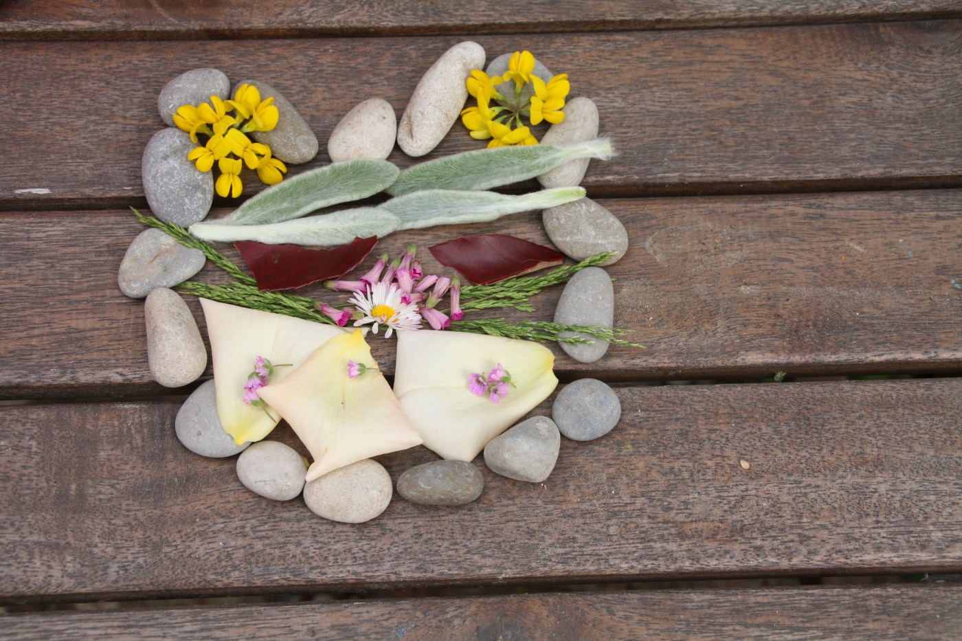 Restons dans le jardin pour s’adonner au land art. Cette fois-ci j’ai délimité avec des galets deux formes à décorer avec des éléments naturels du jardin. Comme, c’était à l’occasion de Pâques, c’était censé représenter un œuf et un lapin. Bref, si vous voyez un chat… moi aussi 😉