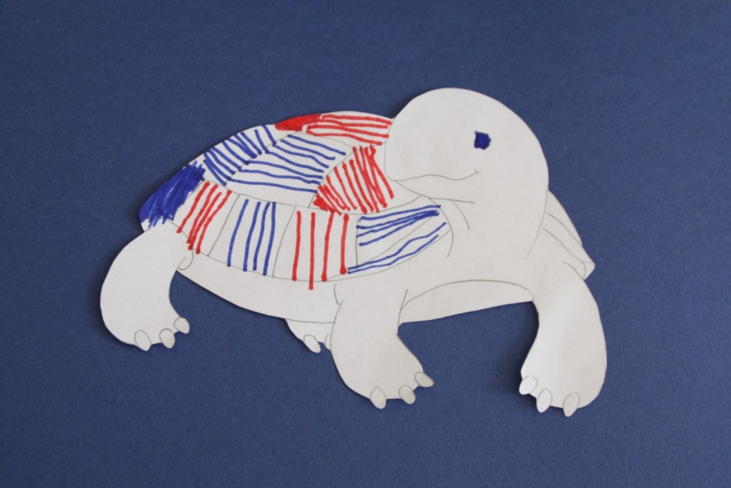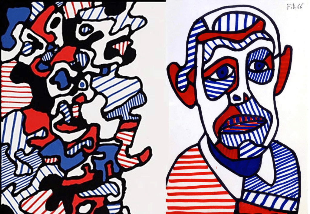 Enfn, la troisième idée est de s’inspirer d’un des six autoportraits de Jean Dubuffet. Dans les années 60, il a dessiné son autoportait avec des formes constituant les différentes parties de son visage, lesquelles étaient soit remplies de hachures, soit complètement coloriées avec du bleu, du rouge ou les deux. J’ai utilisé un coloriage de tortue, les écailles étant un ensemble de formes bien délimitées pour réaliser cette revisite, avec des lignes horizontales, verticales ou obliques.
