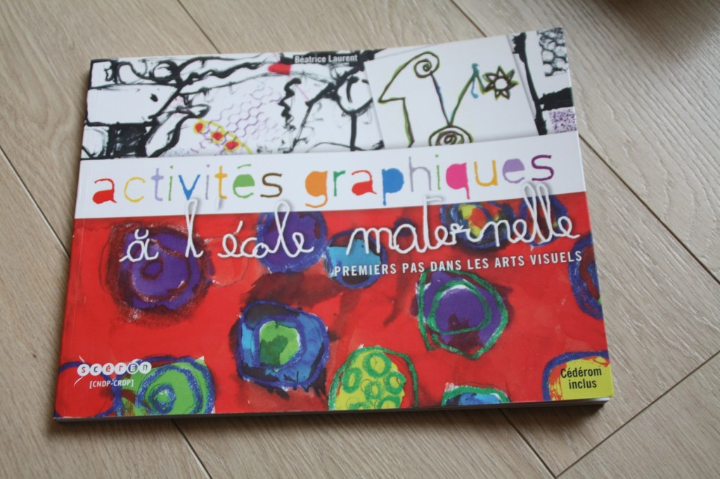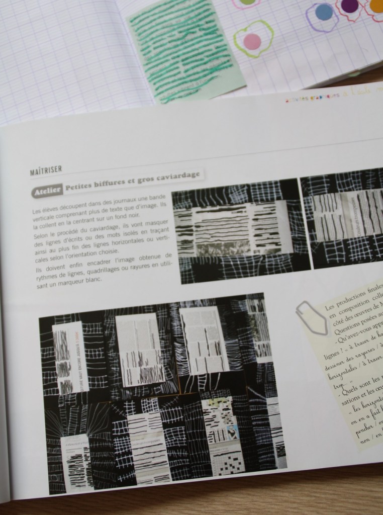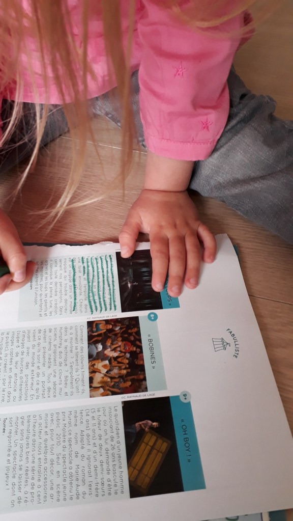 La première idée vient du livre Activités graphiques à l’école maternelle des éditions SCEREN. Il s’agit de masquer des lignes d’écrits en traçant des lignes. J’ai donc donné un magazine et un feutre à la cadette pour faire ce caviardage.