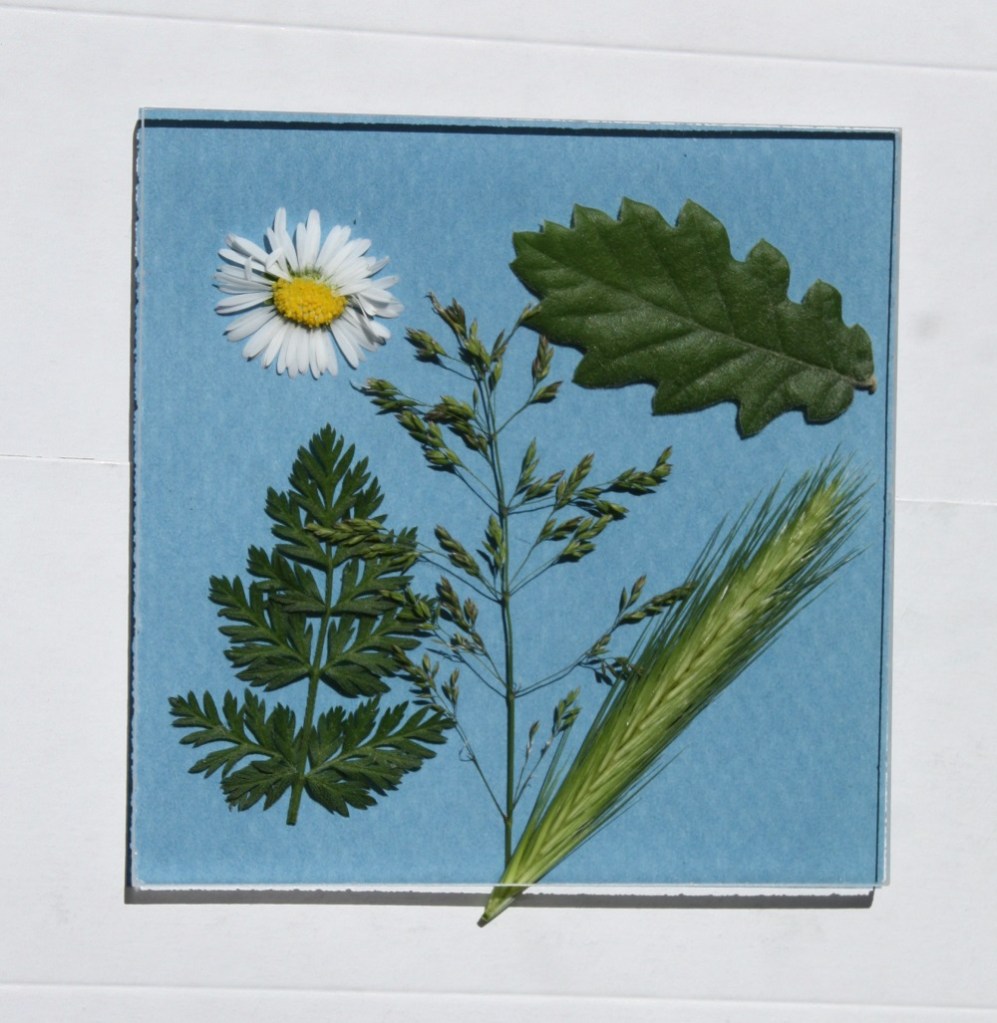 Nous avons cherché quelques végétaux dans le jardin, les avons déposé sur la feuille, avons posé par dessus le plexiglas et laissé cela au soleil.