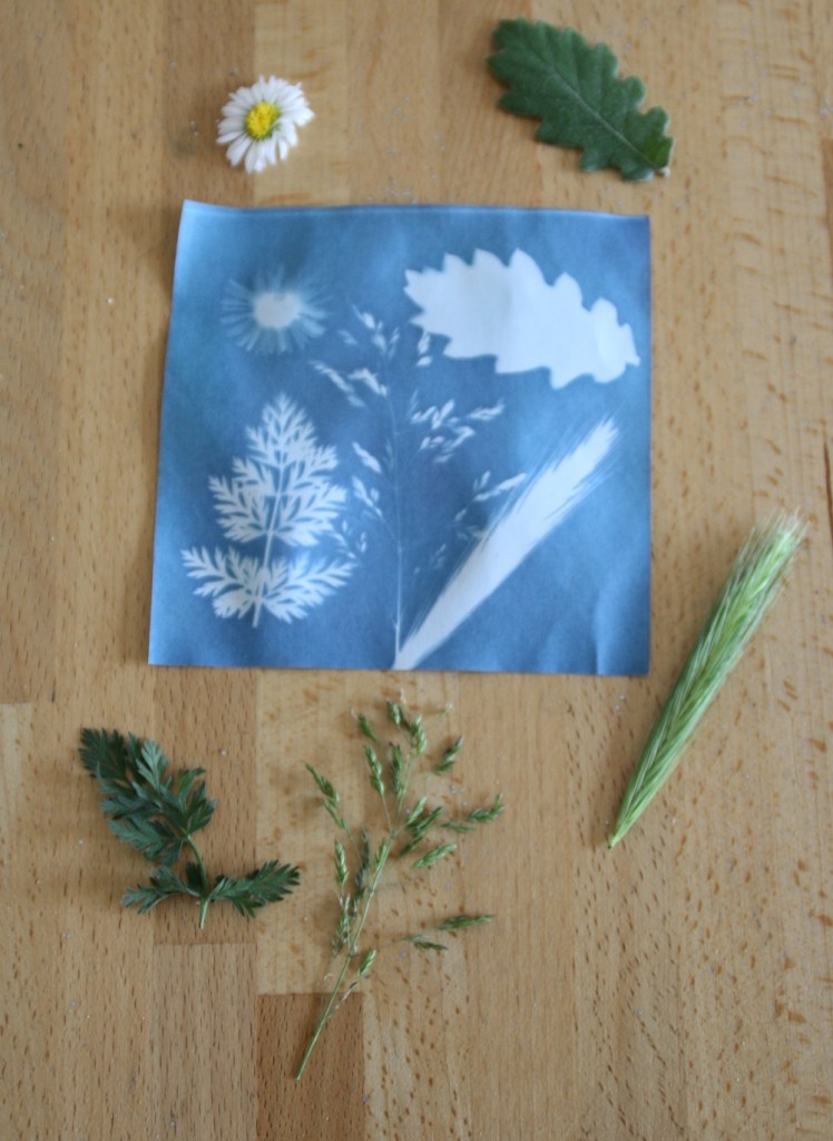 Il est noté sur l’emballage que cette étape dure de 1 à 5 minutes, mais la boutique chez qui j’avais acheté le kit (Au son des grillons) m’a conseillé plutôt 15 minutes. En fait, il faut attendre que les parties de la feuille non recouvertes passent du bleu au blanc. Puis, pour arrêter le processus, nous avons trempé la feuille une minute dans l’eau et laissé sécher. Les couleurs s’inversent comme avec un négatif. Les parties non couvertes deviennent bleues, tandis que les végétaux apparaissent en blanc.