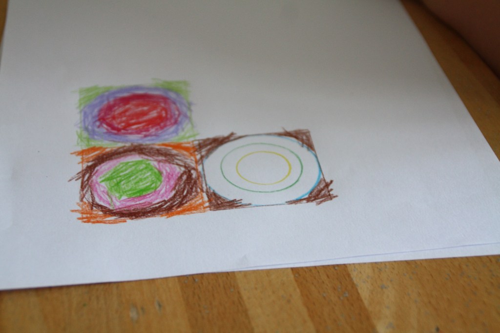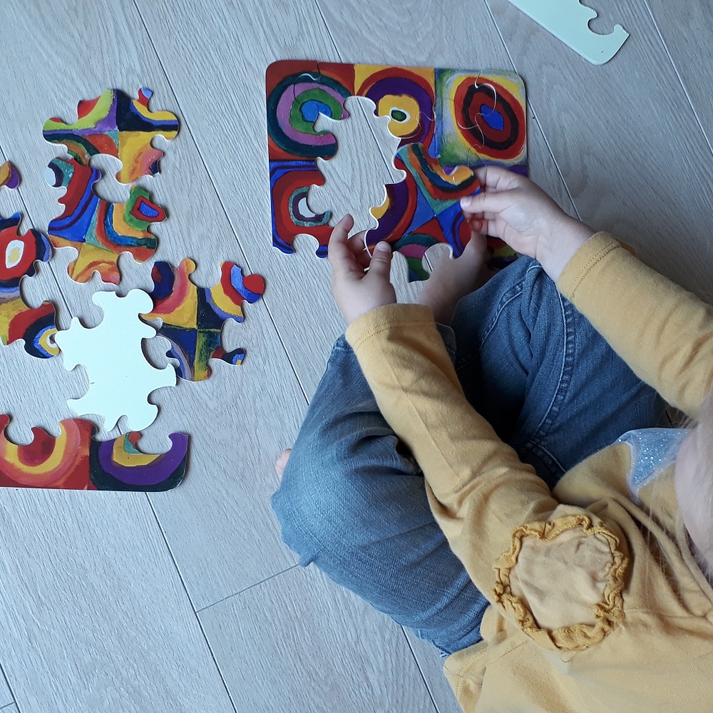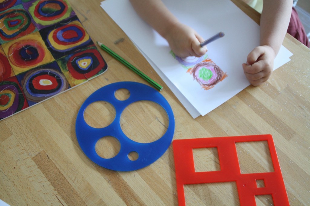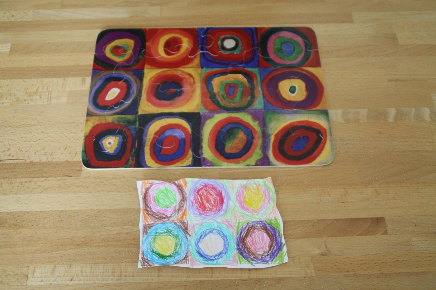 Il y a une oeuvre de Wassily Kandinsky qui semble très souvent exploitée à l’école maternelle : Carrés avec cercles concentriques. Nous avons un puzzle de ce tableau, alors j’ai proposé à la cadette de le revisiter.