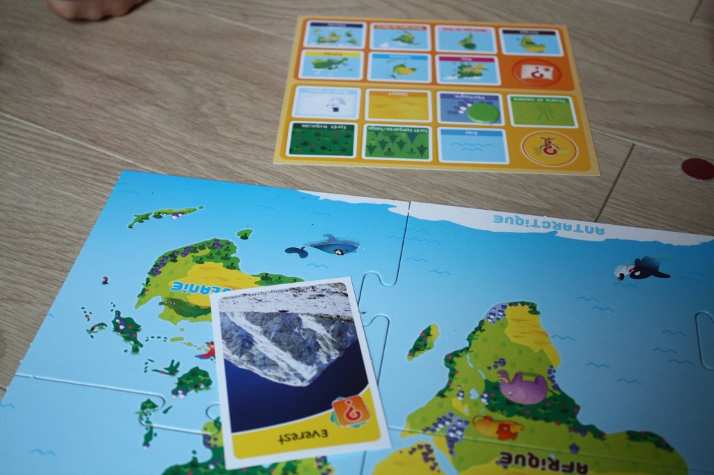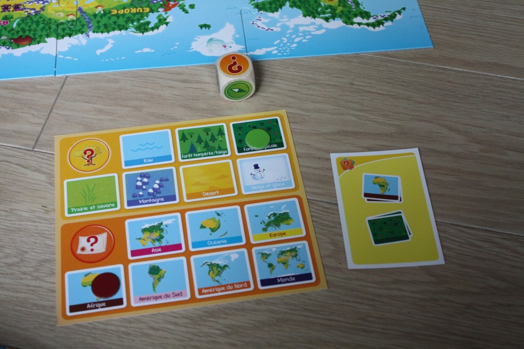Cette épreuve consiste à définir où est l’habitat d’un animal ou où se localise un paysage, un plante ou un monument : sur quel continent et dans quel type de milieu (désert, mer, forêt tempérée…). Nous avons ce jeu depuis les 6 ans de l’aînée. Au départ, ne connaissant pas les continents, elle avait du mal avec cette première épreuve. Heureusement, il y a des variantes selon l’âge des enfants.