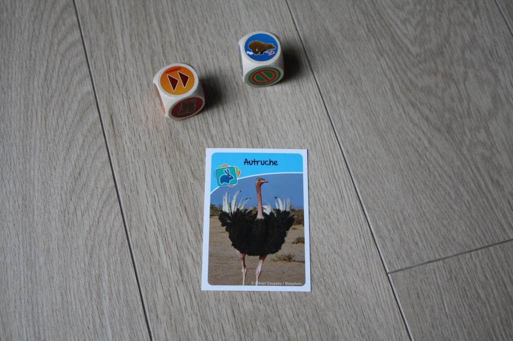 Il faut mimer un animal en sélectionnant une carte au hasard. Il y a deux dés qui ajoutent des difficultés comme ce qu’il est en train de faire (manger, rencontrer d’autres animaux…) et d’autres contraintes (le miner au ralenti, en marche arrière…). Allez miner un ours en train de dormir et au ralenti. C’est cocasse. Parfois, selon le résultat des dés, nous ignorons ces consignes.