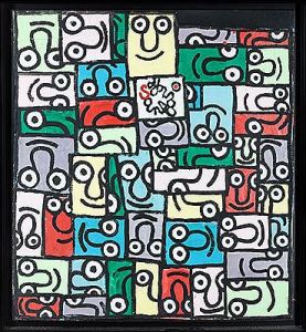 Grâce à la maitresse, nous avons découvert l’artiste Jean-Joseph Sanfourche. Peintre, sculpteur, poète français qui a vécu de 1929 à 2010 ; c’est une figure de l’art brut. Encore un artiste contemporain revisité ? Et oui. L’œuvre qui nous a inspirée est Composition aux mille visages.