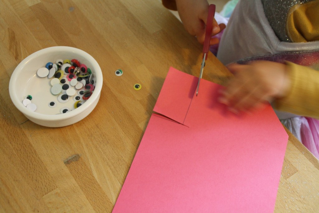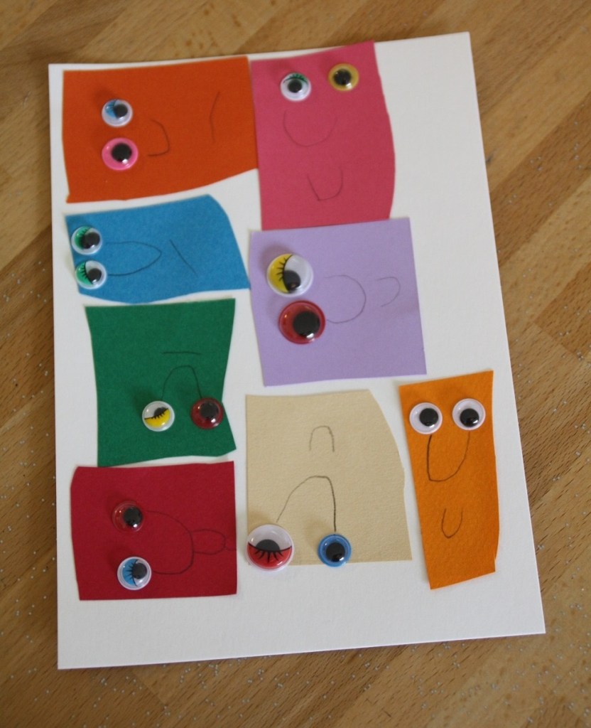 La cadette a choisi des papiers de couleurs. J’y ai tracé des formes rectangulaires, volontairement de tailles irrégulières. Elles les a découpées. Puis elle a collé sur chaque deux yeux mobiles, avant de dessiner le nez et la bouche au crayon noir. Au départ, elle ne savait pas trop comment dessiner un nez. Je lui ai fait remarquer que l’artiste les avaient tracé un peu comme des lettres U. Les premiers étaient dessiné au centre du rectangle et puis, elle a vu que sur l’œuvre originale, le tracé du nez partait des yeux. Pour la bouche, elle a choisi d’en faire sourire certains, mais d’autres non.