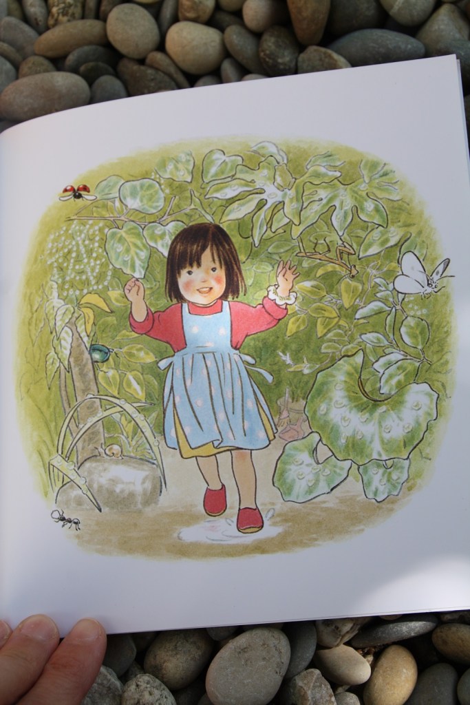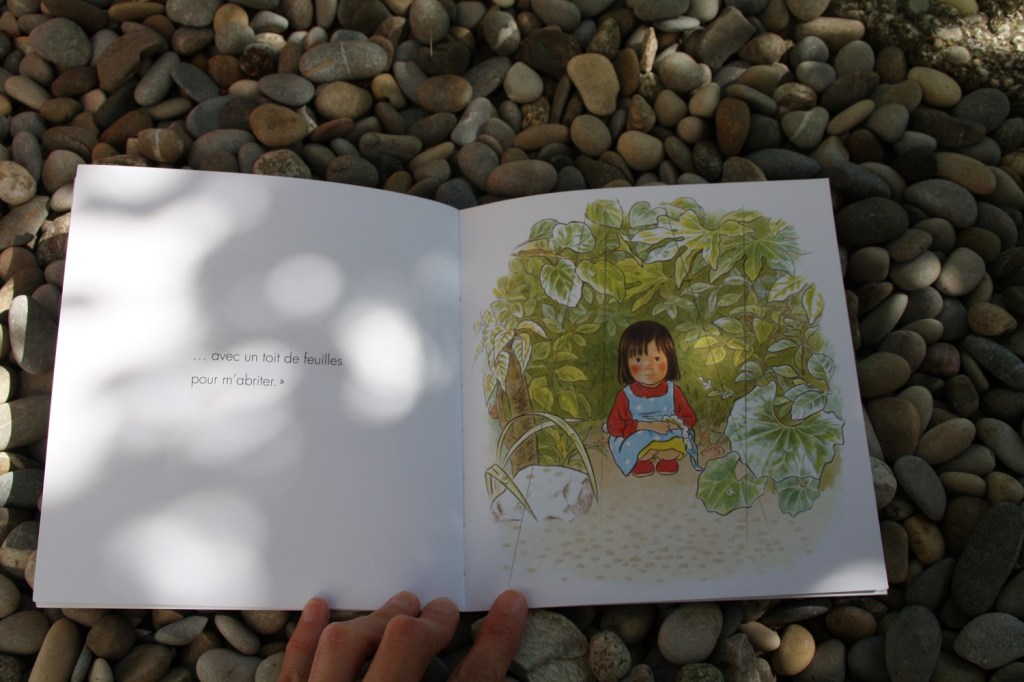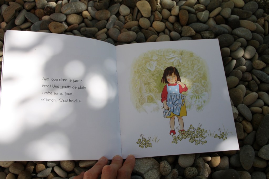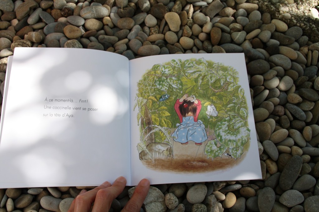 Aya, elle, aux premières gouttes de pluie se réfugie sous les branchages. C’est sa petite cabane. Mais les petites bêtes du jardin viennent vite s’y abriter aussi. Coccinelle, fourmi, mante religieuse papillon, scarabée… Tout ce petit monde attend la fin de la pluie à l’abri des branches. Justement le soleil revient « Allez les insectes, rentrez chez vous. Vos mamans vous attendent… »