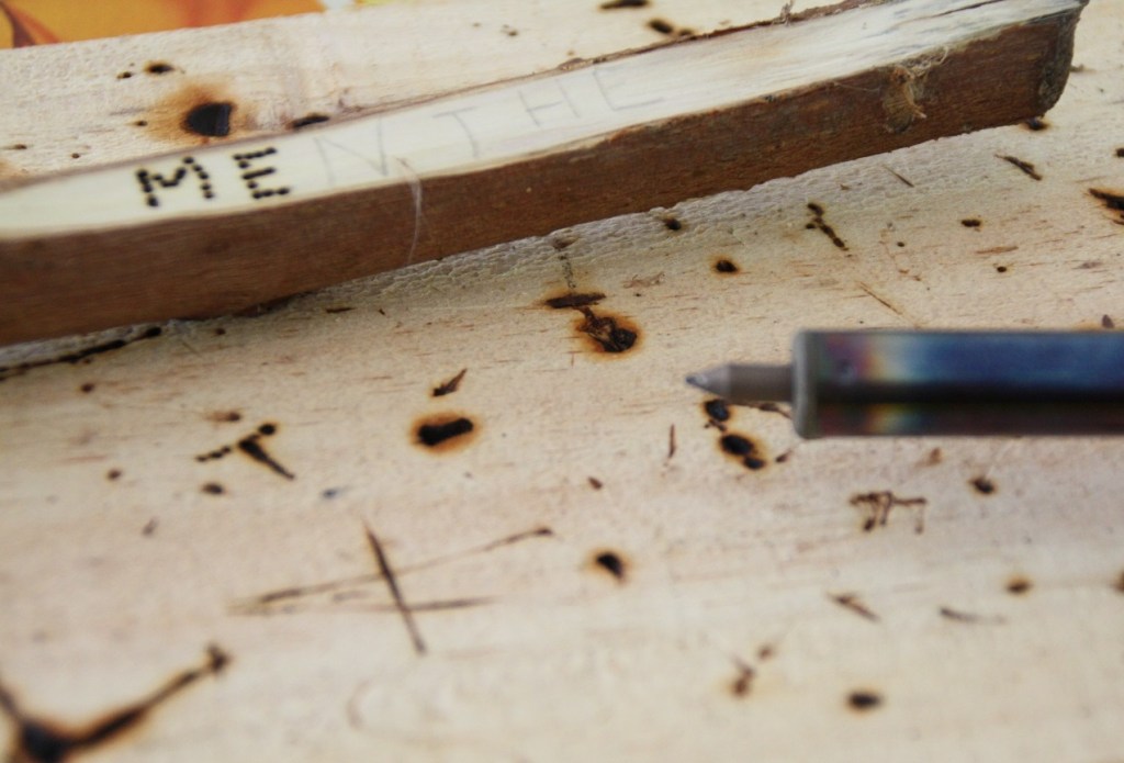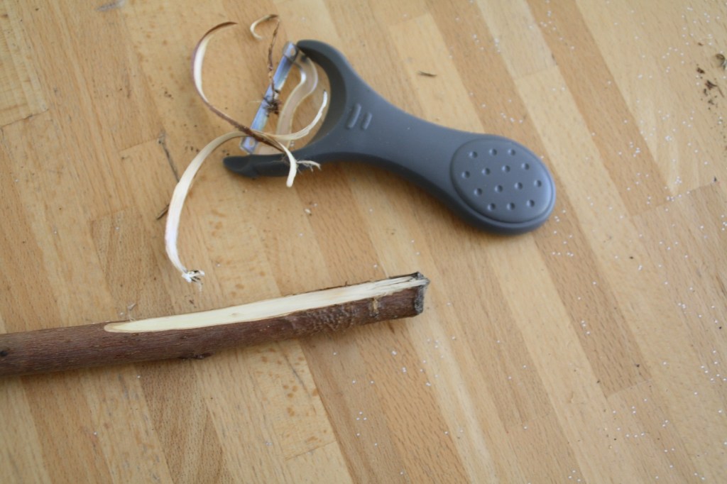 Nous avons récupéré quelques branches de troène. Sur internet, j’ai trouvé l’astuce pour enlever l’écorce facilement sur une partie de la branche : il suffit de se servir d’un éplucheur. Ensuite, nous avons utilisé le pyrograveur pour marqué le nom de chaque plant ou semis. La grande m’a aidée pour faire ces étiquettes.