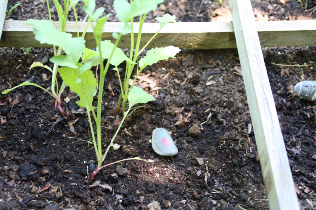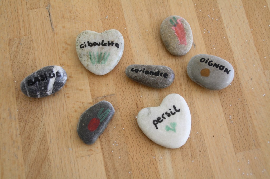 Nous avons utilisé des marqueurs multi-supports pour écrire et dessiner sur les galets. Je les ai vernis pour une meilleure tenue dans le temps. La cadette s’est chargée de dessiner la carotte et le radis.