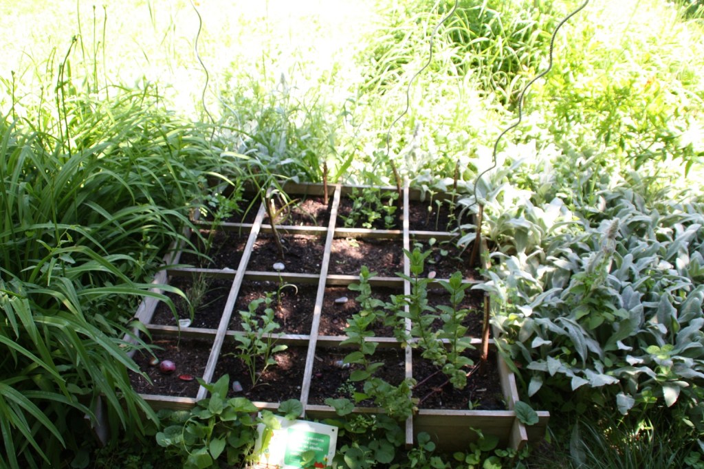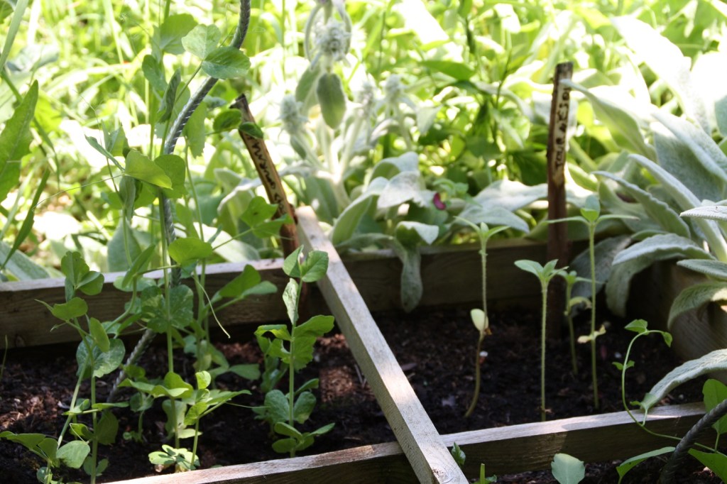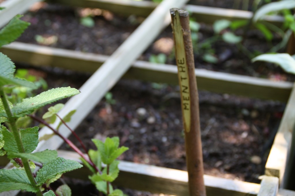 L’an dernier, nous avions commencé à remplacer nos pancartes en plastique par des galets pour indiquer quelques plantes aromatiques poussaient dans le carré potager. Les lettres au marqueur s’était un peu effacées. Alors, nous avons tout refait. Pour les légumes et les plantations prenant de la hauteur, nous avons fait des étiquettes en bois, pour les autres encore des galets.