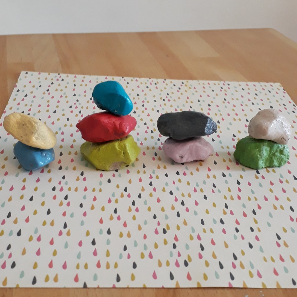 Ce sont 7 tours de pierres peintes, de 10 mètres de haut. Et elles nous ont inspirées pour une version beaucoup plus petite avec les cailloux du jardin. Nous avons peint nos cailloux avec de la peinture acrylique. Et puis, nous avons essayé de les mettre les uns sur les autres en équilibre. Nous n’avons pas 7 totems, mais cela fait un jeu qui demande de la concentration… un jeu aussi pour les parents gagnants ex aequo avec une tour de 5 cailloux.