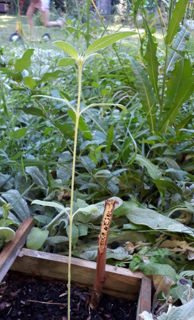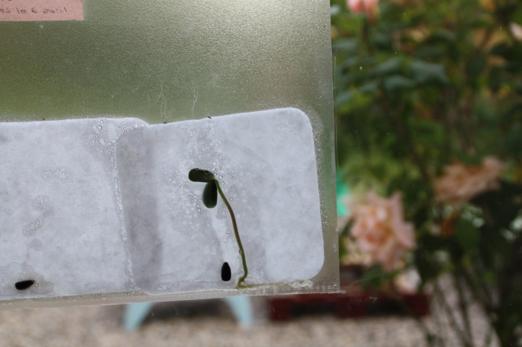 Presque chaque année, nous essayons de faire pousser des graines de tournesol… sans succès. Cette année, nous avons commencé par observer la germination de la graine. Dans une pochette plastique fixée sur une fenêtre, à l’intérieur de la maison, nous avons planté une graine de tournesol (enfin deux, mais une seule a germé) dans un peu de coton. Chauffée par le soleil, la pochette plastique jouait le rôle de serre. Nous avons pu voir la graine s’entrouvrir et la germe, puis la pousse grandir. Au bout de 10 jours, nous avons replanté cette jeune pousse dans le potager. Nous ne voyons toujours pas la fleur. Mais nous avons pu voir tout le cycle de vie du tournesol dans le livre Emy et les tournesols dont je vous parlerai demain.