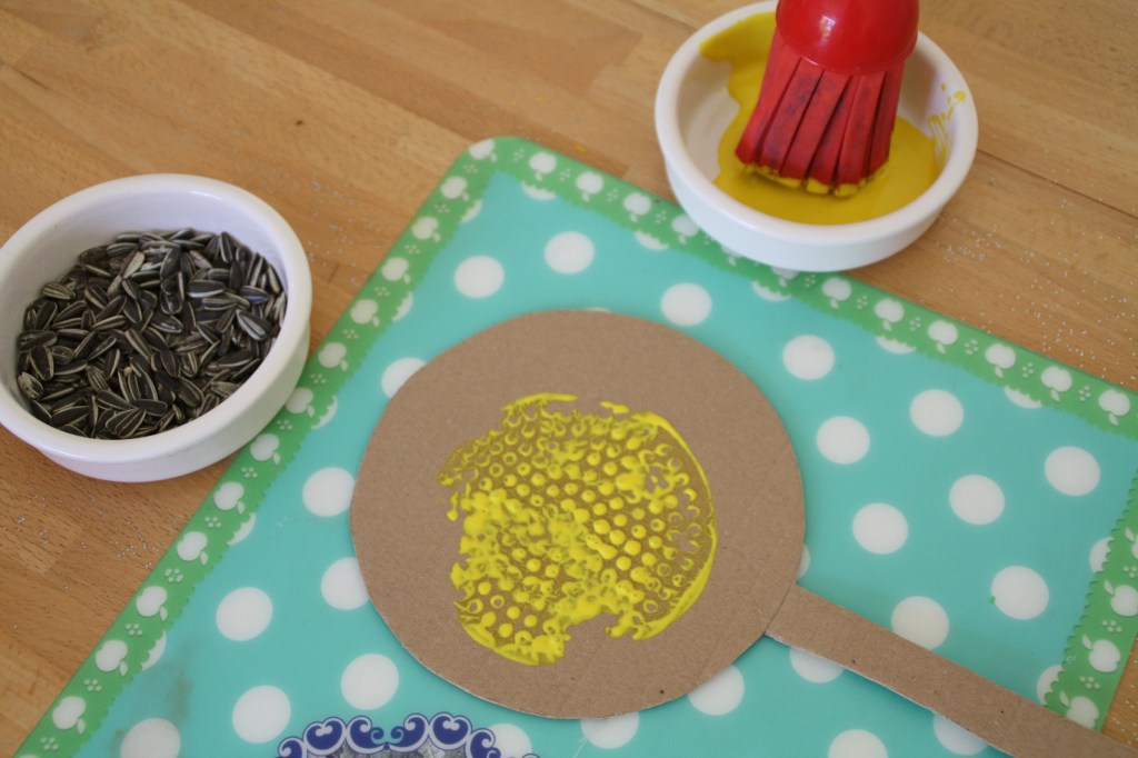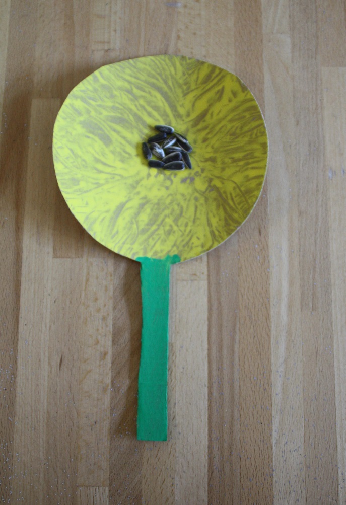 Pendant ce temps, avec la cadette, nous avons créé un tournesol en carton. J’ai découpé dans un carton la fleur et la tige. Ma fille a peint la tige en vert, le centre de la fleur en jaune avec un presse purée et les pétales au pinceau toujours en jaunes. Elle a ensuite collé des graines de tournesol (celles réservées aux oiseaux pendant l’hiver) au centre de la fleur. Voilà, notre tournesol qui décore notre table des saisons pour cet été.